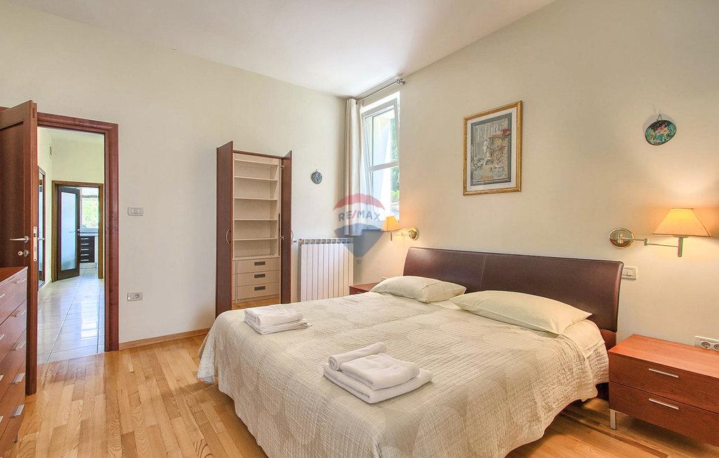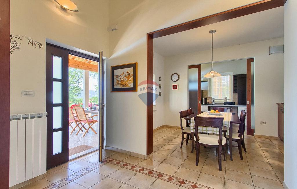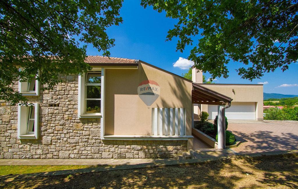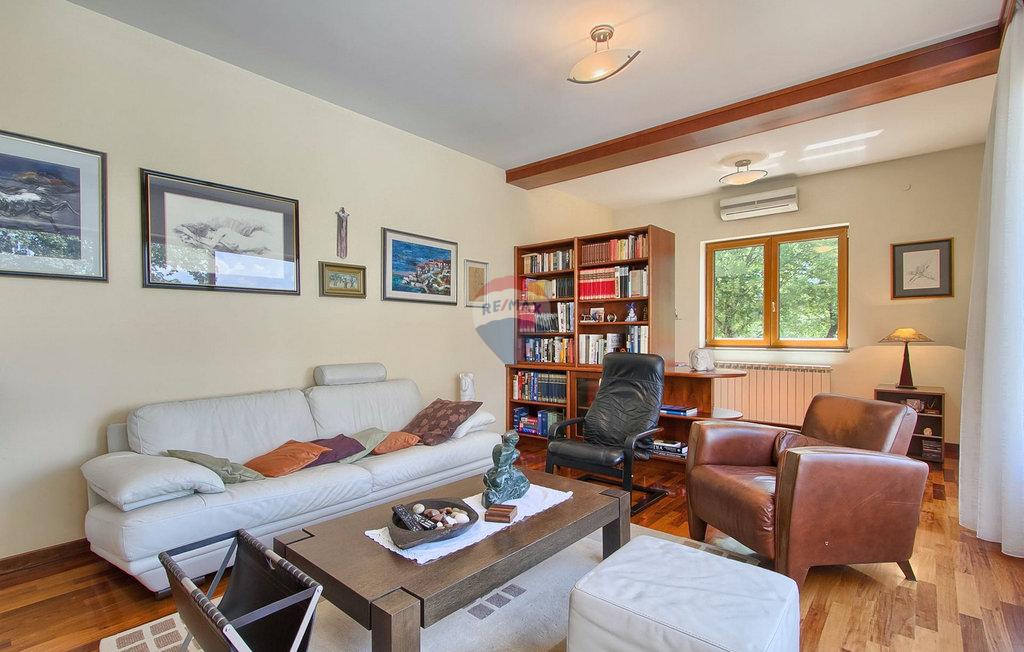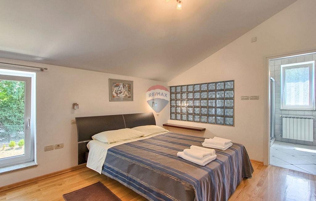 m2 i konoba površine 30 m2 s kaminom i kotlovnicom. Prizemlje otvorenog koncepta površine 110 m2, sastoji se od ulaza, blagovaone, dnevne sobe, kuhinje, ostave, WC-a, spavaće sobe s garderobom i kupatilom. Na katu površine 72 m2, nalaze se dvije spavaće sobe s kupatilima, garderobom, lođom, radnom sobom i ostavom. Po potrebi radna soba može postati 4 spavaća soba. Kuća je građena s vrlo kvalitetnim materijalima. Grijanje je centralno na naftu i kuća je u potpunosti klimatizirana. Dvorište je odlično uređeno, s mediteranskim biljem a kuća se nalazi u pravoj maloj hrastovoj šumi. Bazen je površine 40m2 te modernog oblika, također grijan.