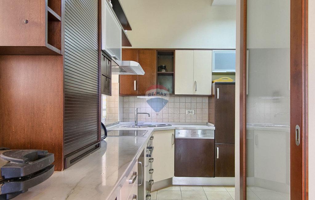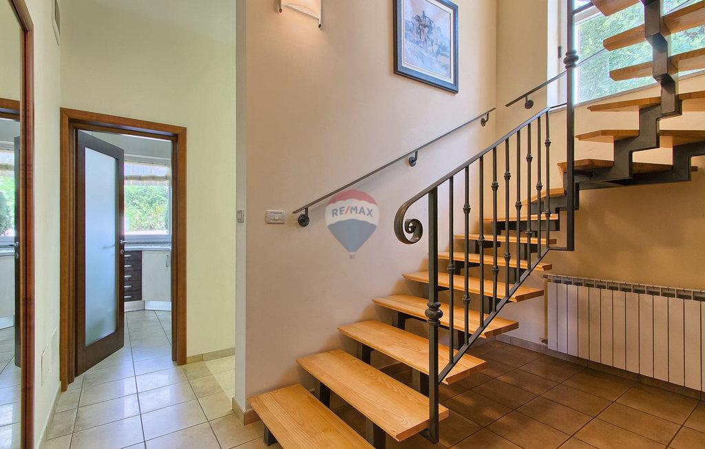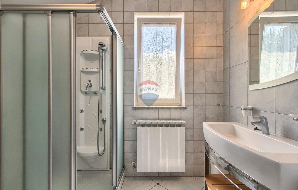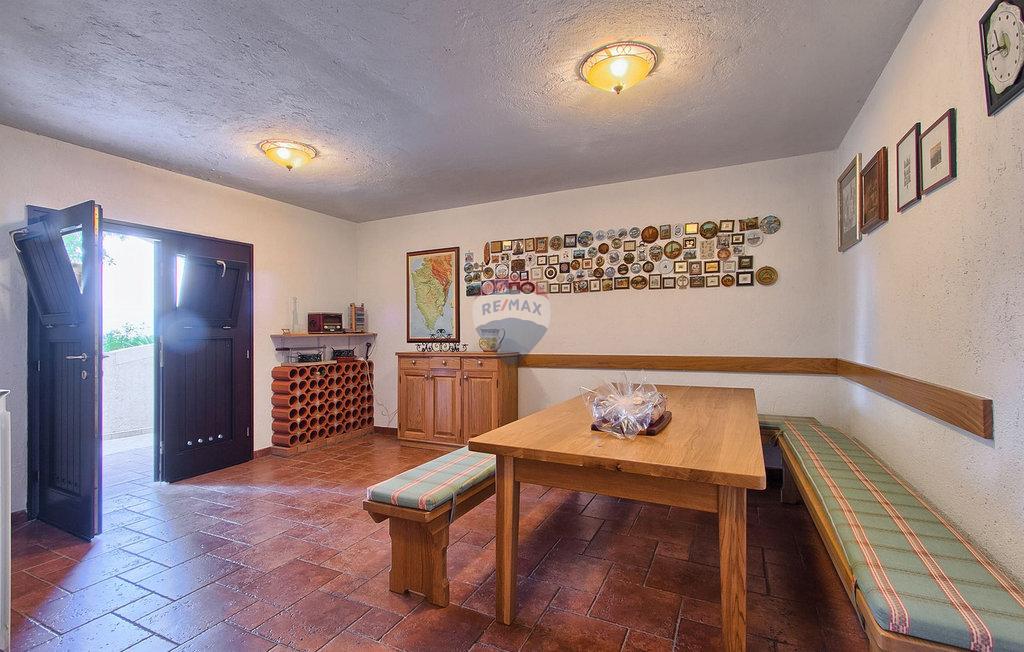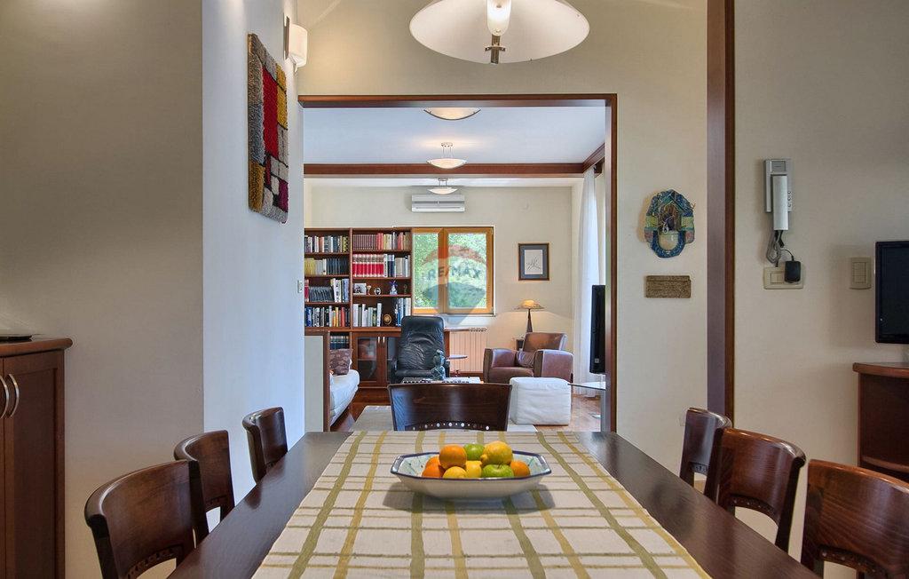 m2 i konoba površine 30 m2 s kaminom i kotlovnicom. Prizemlje otvorenog koncepta površine 110 m2, sastoji se od ulaza, blagovaone, dnevne sobe, kuhinje, ostave, WC-a, spavaće sobe s garderobom i kupatilom. Na katu površine 72 m2, nalaze se dvije spavaće sobe s kupatilima, garderobom, lođom, radnom sobom i ostavom. Po potrebi radna soba može postati 4 spavaća soba. Kuća je građena s vrlo kvalitetnim materijalima. Grijanje je centralno na naftu i kuća je u potpunosti klimatizirana. Dvorište je odlično uređeno, s mediteranskim biljem a kuća se nalazi u pravoj maloj hrastovoj šumi. Bazen je površine 40m2 te modernog oblika, također grijan.