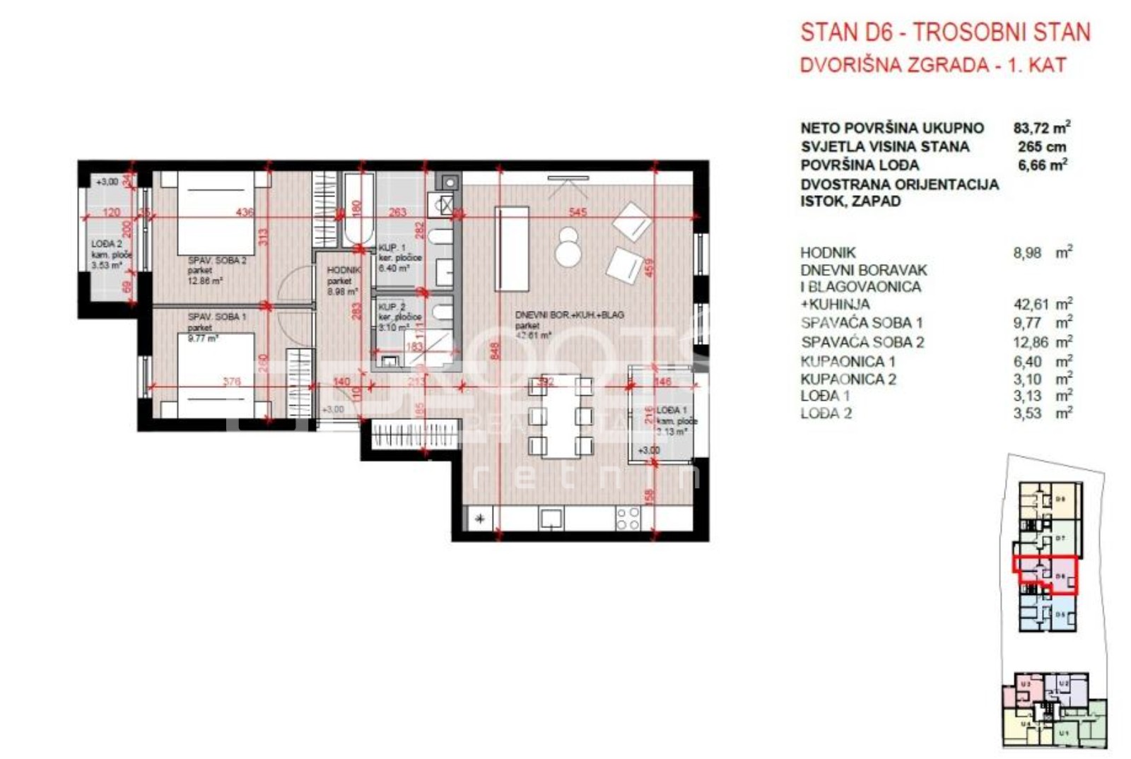 Stan D6 je smještn na prvom katu ukupne površinu 89m². Sastoji se od ulaznog hodnika, open space boravka s kuhinjom i blagovaonicom, dvije spavaće sobe, dvije kupaonice, i lođa.