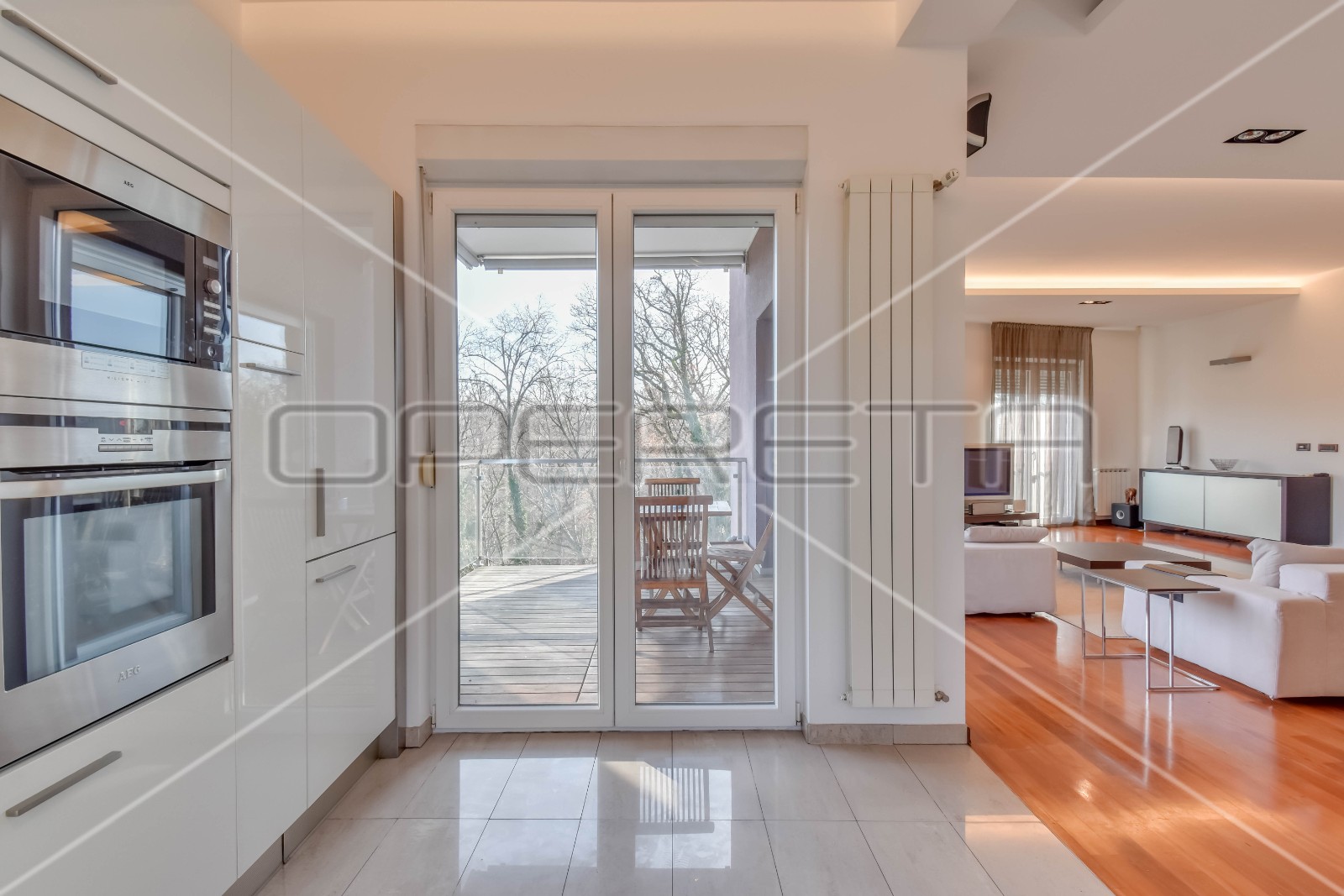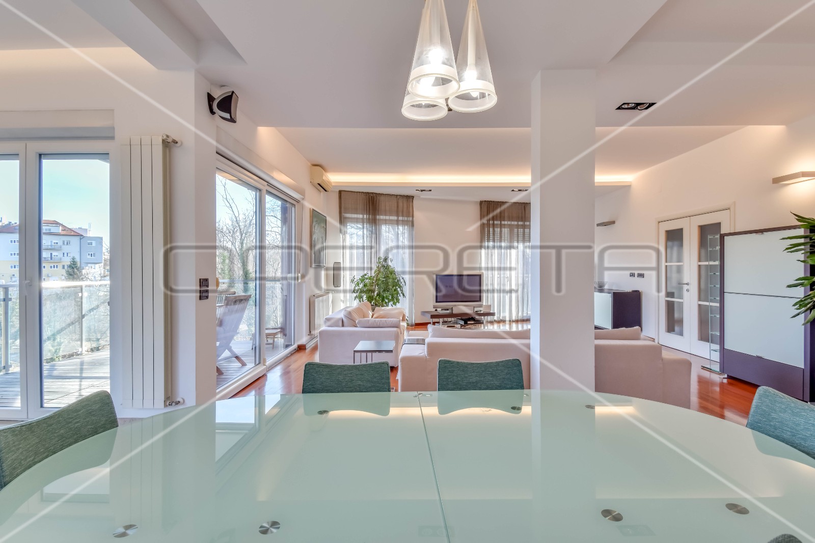 išta unutar stana, prostranog dnevnog boravka s blagovaonicom i kuhinjom iz kojih se izlazi na balkon.