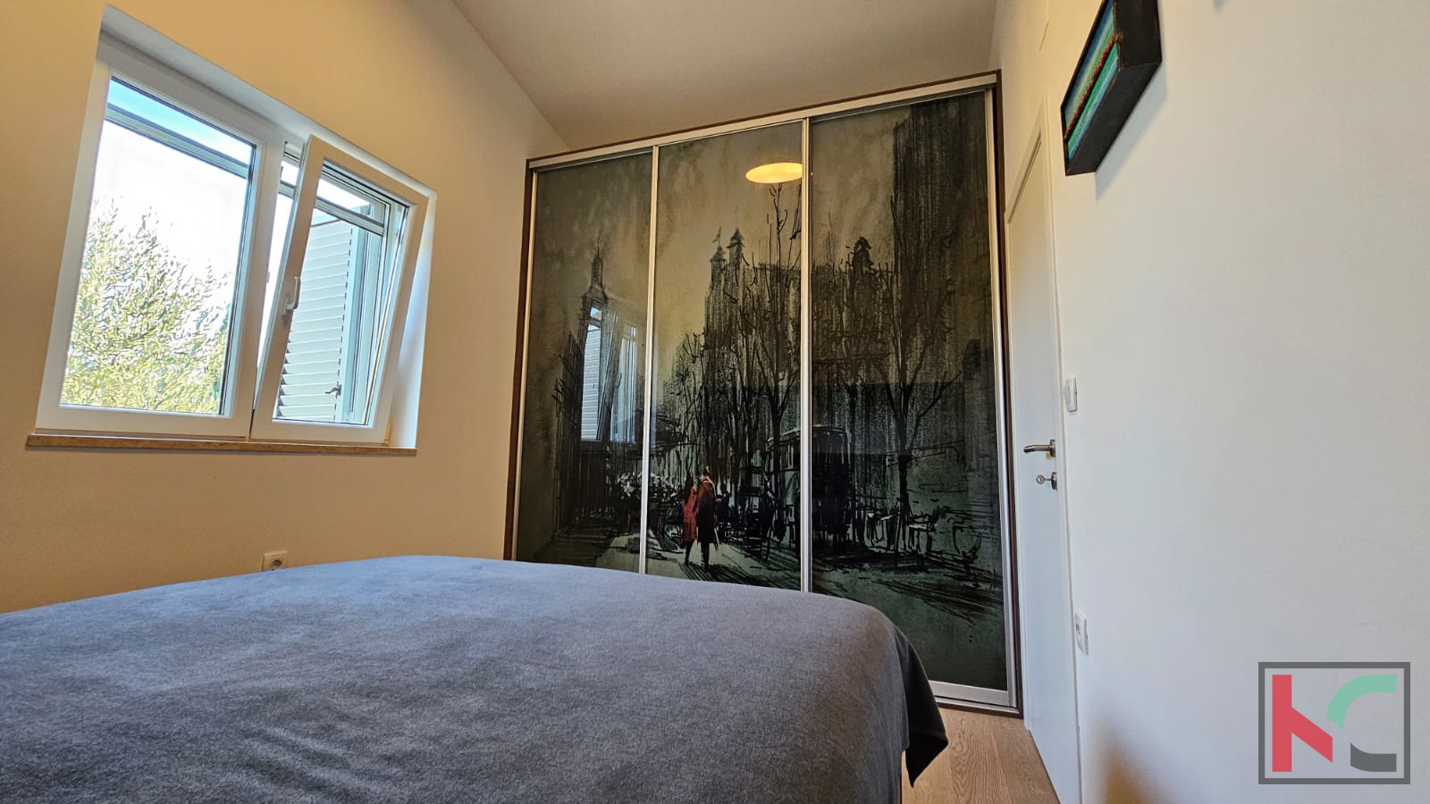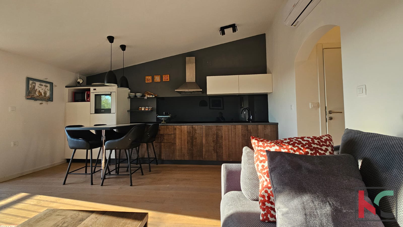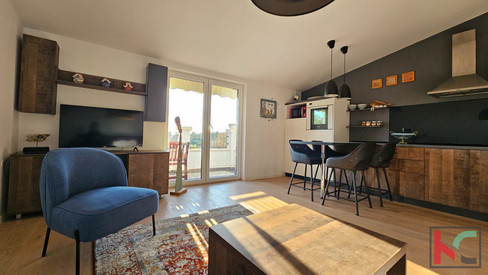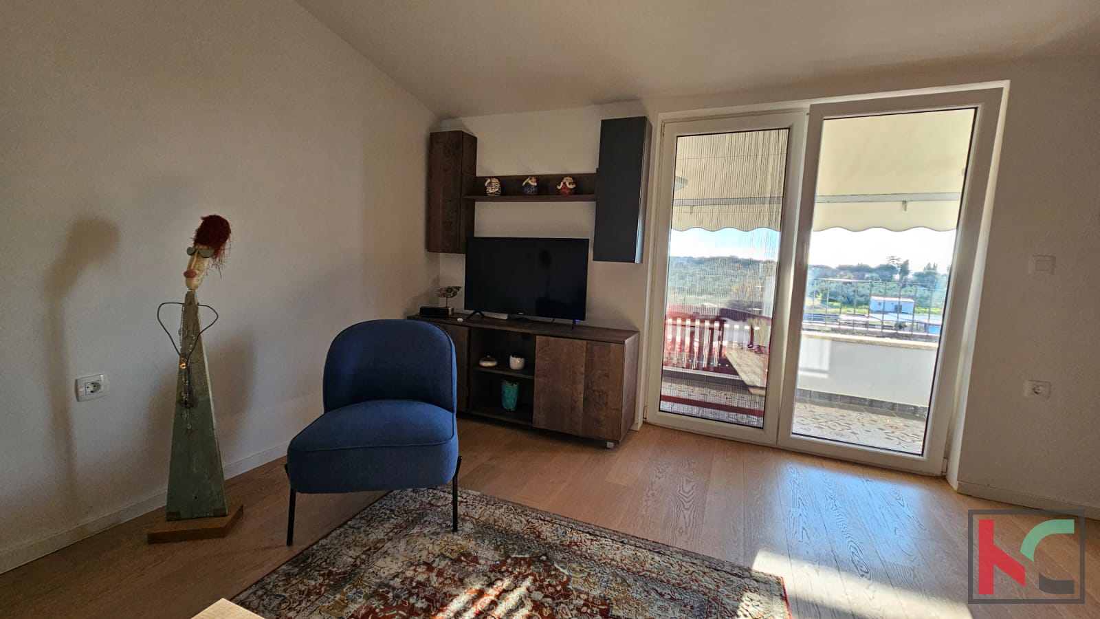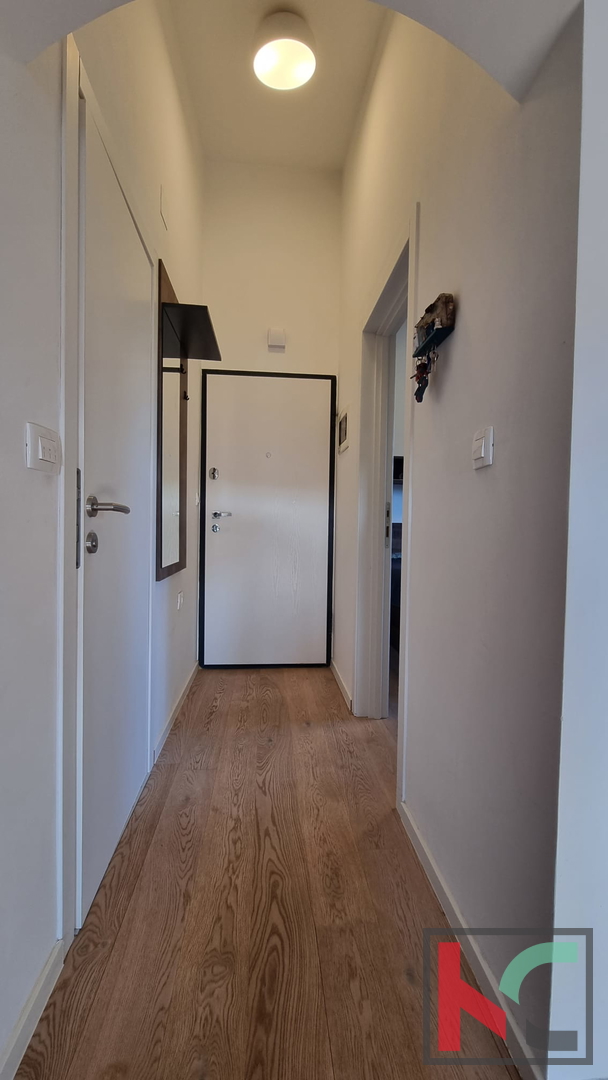 We are selling a beautiful sunny apartment in a quiet neighborhood near the center of Rovinj. It is located in a small residential building with only 6 apartments, with a total living area of m2 and includes one parking space. Through a well-maintained staircase, we enter the apartment which consists of an entrance hallway, bathroom, bedroom, large living room combined in an open space with the kitchen, and access to a sunny terrace. The apartment is extremely sunny, bright, and beautifully stylishly furnished. It is sold fully furnished and equipped with all necessary household appliances. A very pleasant and beautiful apartment with a wonderful open view of nature and greenery, and only 800 meters away from the sea.