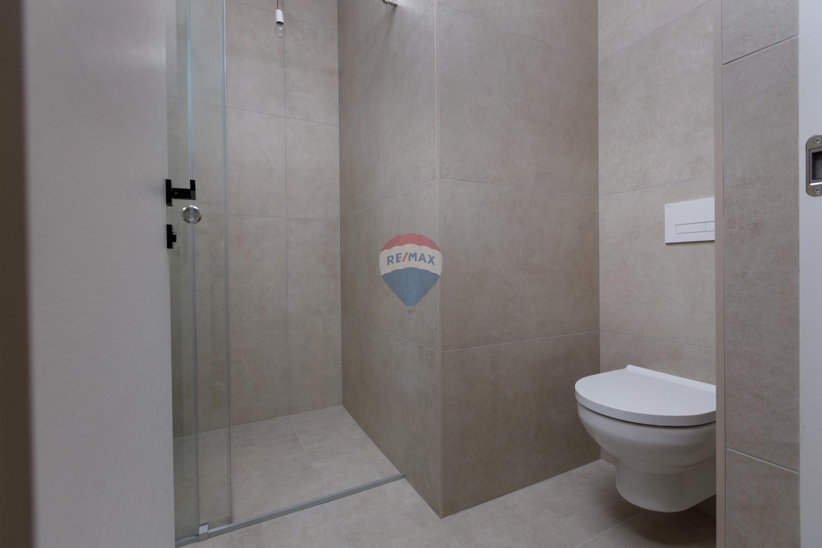 The apartment in question is located on the high ground floor (there are garages on the lower floor) with a total area of 86.99 m2, and consists of: 2 bedrooms (each with its own bathroom), additional toilet, living room with kitchen and dining area, hallway and covered terrace with sea view.
