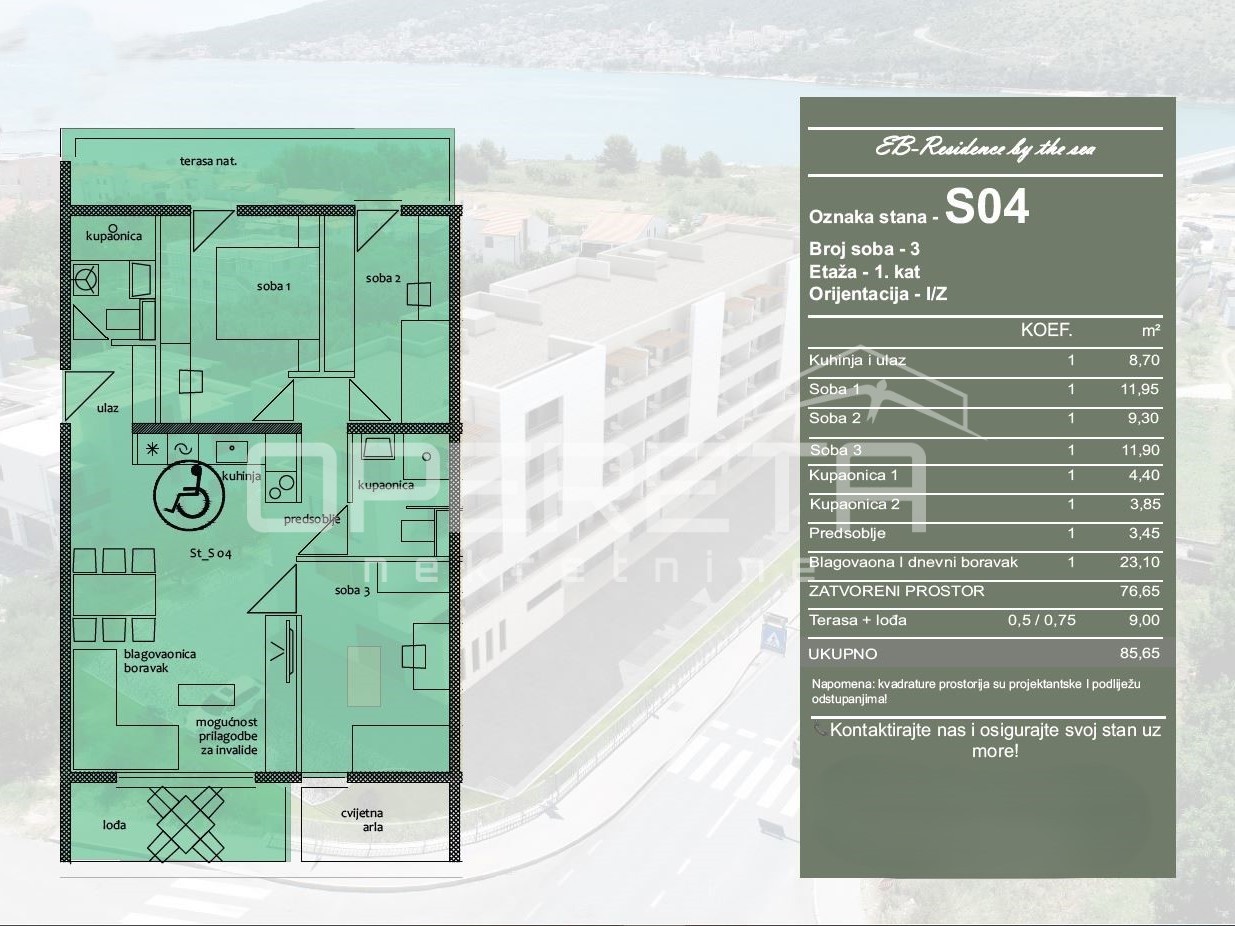 In a quiet and attractive area of Trogir, just a few minutes' walk to the sea and the historic core of the city, this three-bedroom apartment marked S4 is located on the first floor of a contemporary residential building with an elevator. This property represents an excellent combination of functionality, modern architecture, and a desirable location, making it an ideal choice for living, vacationing, or investment in tourist rental.