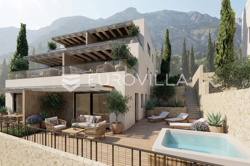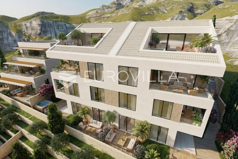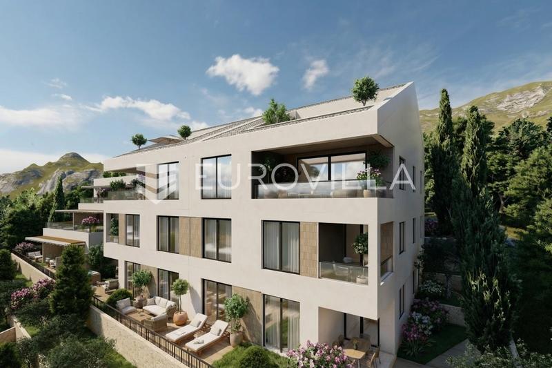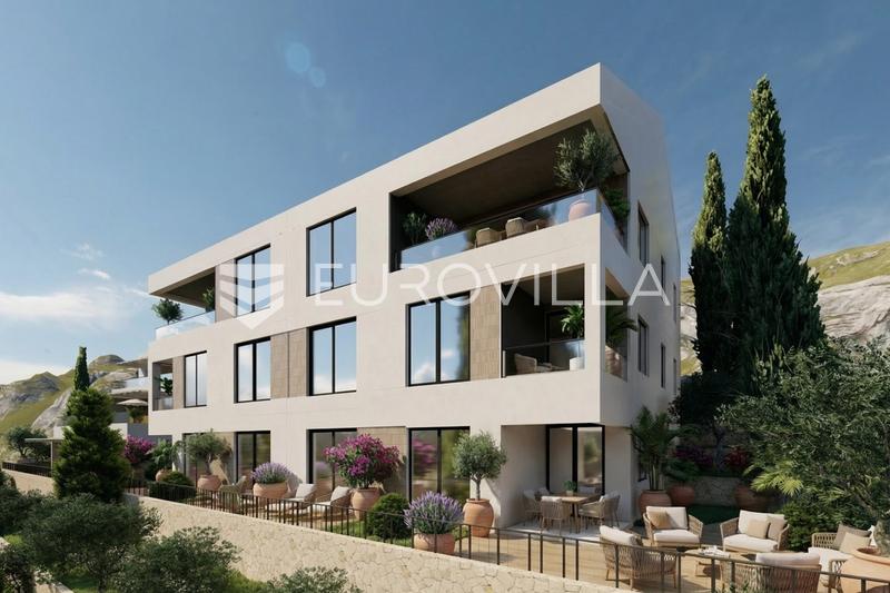 Omis, Nemira, one-bedroom apartment on the ground floor in modern new building, 68.88 m²