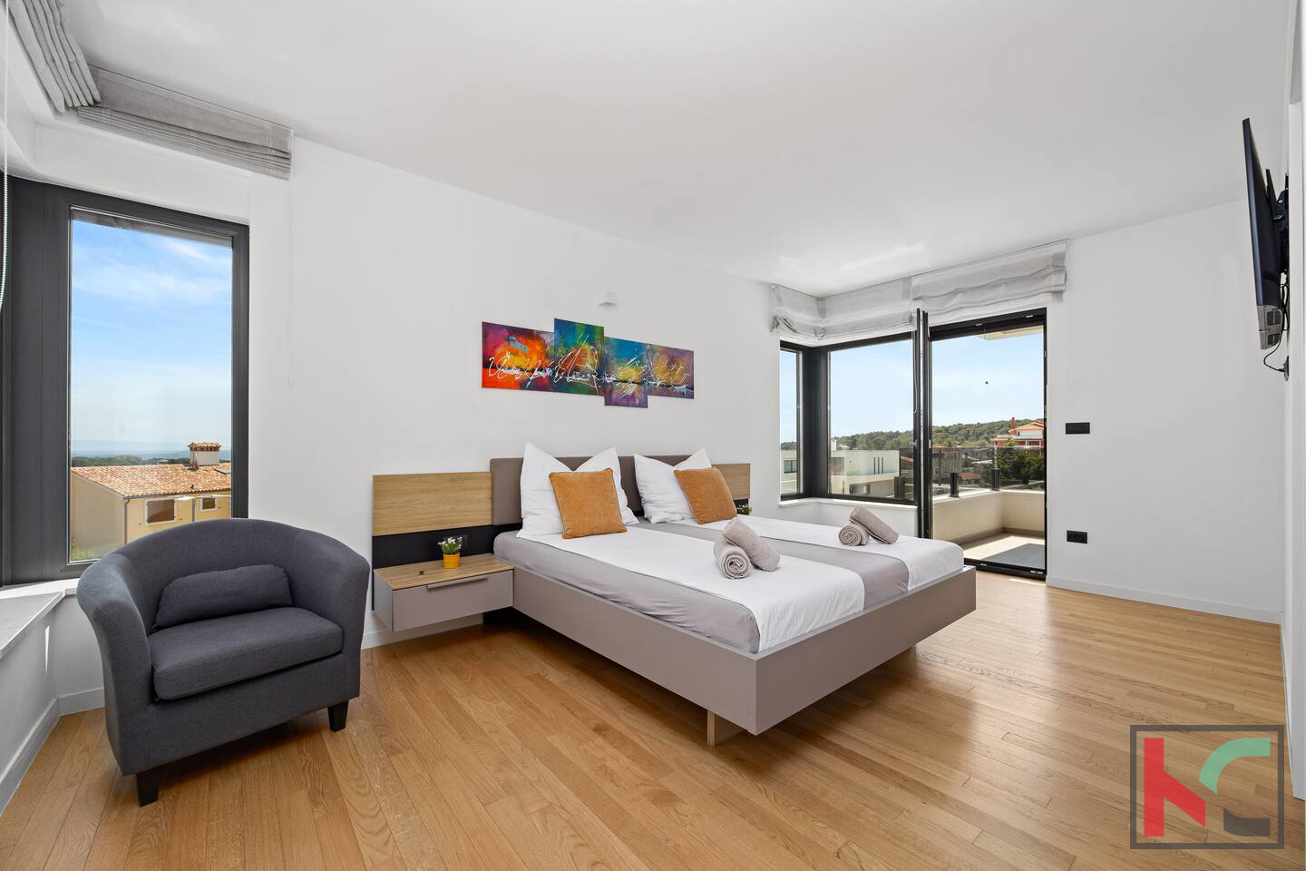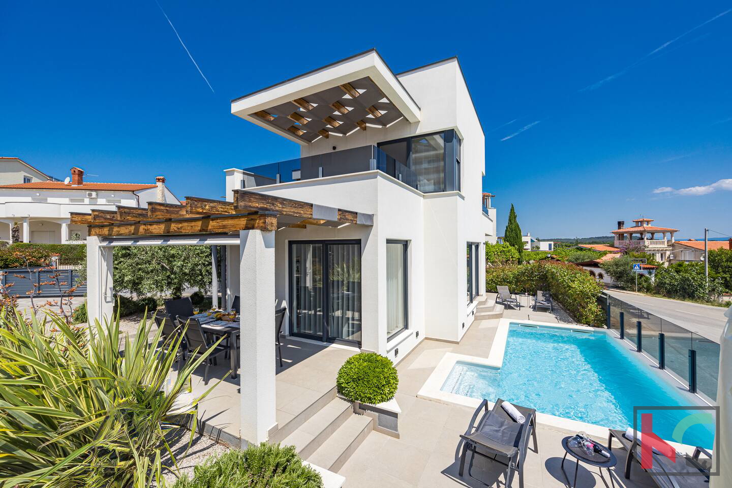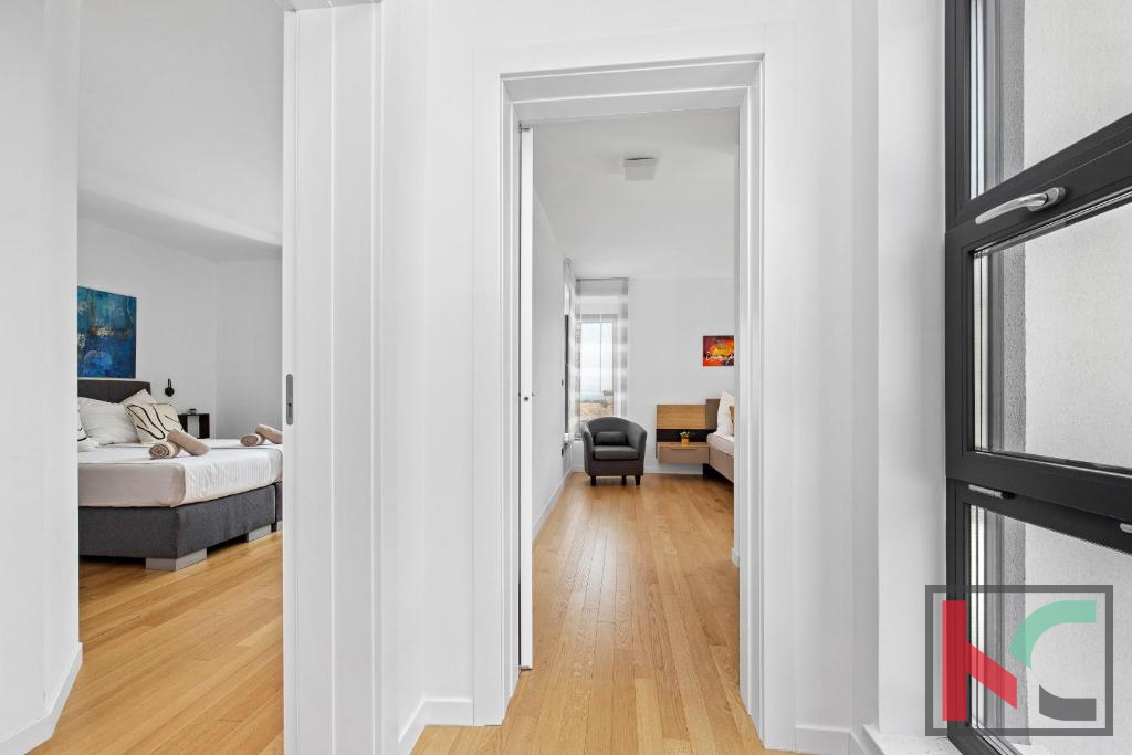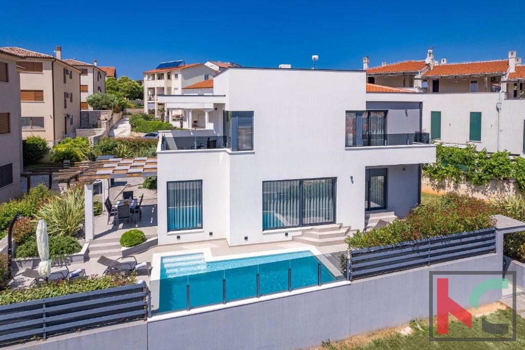 Prodajemo samostojeću vilu s bazenom i panoramskim pogledom na more i Kvarner koja se proteže na dvije etaže te je ukupne površine 130m2 smještena na okućnici od 450m2 i udaljena svega 500m od mora. Prizemlje vile sastoji se od ulaznog hodnika, open space prostora sa dnevnim boravkom, kuhinjom i blagovaonom te velikim staklenim stijenama sa izlazom na natkrivenu terasu i bazen. U prizemlju vile također su smješteni gostinjski toalet, jedna spavaća soba s vlastitom kupaonicom i ostava. Okućnica vile uređena je u mediteranskom stilu te nudi potpuni mir i uživanje na otvorenom zraku, bazen površine 25 m2 sa sunčalištem, natkrivenom terasom, roštilj, kao i dva parkirna mjesta. Vila posjeduje centralno grijanje na plin i kamin u dnevnom boravku,četiri klima jedinice, po jedna u svakoj spavaćoj sobi i dnevnom boravku, termoizolaciju fasade od 8 cm,podne obloge od parketa i keramike, PVC stolarija s električnim griljama prozorima. Posebnosti ove kuće su svakako lokacija jer je smještena na svega 500 metara od uređenih plaža i šetnica kao i prekrasne Marlere. Prodaje se potpuno namještena, opremljena svim kućanskim aparatima vrhunske kvalitete i trenutno se iznajmljuje u turističke svrhe sa odličnim godišnjim prihodom.