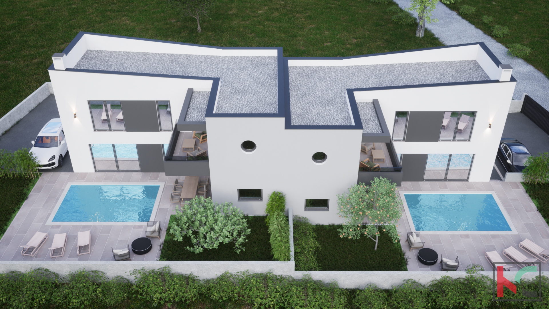 Predstavljamo Vam modernu duplex kuću koja kombinira suvremeni dizajn i vrhunsku funkcionalnost. Ova kuća se prostire na 400 m2 okućnice koju upotpunjuje bazen, sunčalište te velika natkrivena terasa. Prizemlje kuće sastoji se od hodnika, kupatila, ostave, kuhinje sa blagovaonicom te dnevnog boravka sa izlazom na terasu i u dvorište. Stepenicama iz hodnika penjemo se na kat gdje se nalaze tri spavaće sobe, dva kupatila, spremište i natkrivena terasa sa otvorenim pogledom na okućnicu i okolinu. Regulaciju temperature omogućuju klima uređaji kao i mogućnost grijanja na peć, dok kroz ogromne prozore sa aluminijskom/ PVC stolarijom prolazi velika količina prirodne svjetlosti i topline. U vlasništvu kuće su dva parkirna mjesta. Radovi su u visokoj roh -bau fazi te je useljenje predviđeno za lipanj . Ova kuća koja se nalazi u blizini svih neophodnih atrakcija pruža savršenu kombinaciju luksuza i ugodnosti što ju čin idealnim domom za obitelj ili kao kuću za odmor, te odličnu investiciju za turizam.