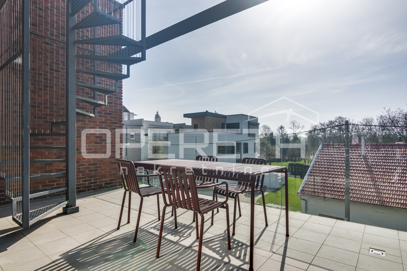 Iznajmljuje se stan u urbanoj vili u kojoj ukupno ima 3 stana. Sastoji se od dnevnog boravka s blagovaonicom i opremljenom kuhinjom iz kojih se izlazi na balkon sa stepenicama koje vode na krovnu terasu s prekr