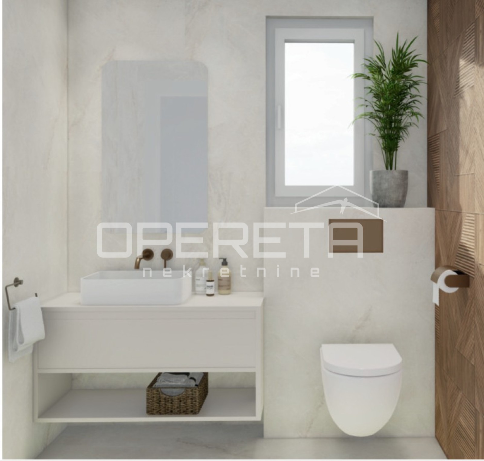 Oprema stana uključuje podno grijanje u cijelom prostoru, klima-uređaj, keramiku vrhunske talijanske kvalitete te sanitarije marke Villeroy & Boch.