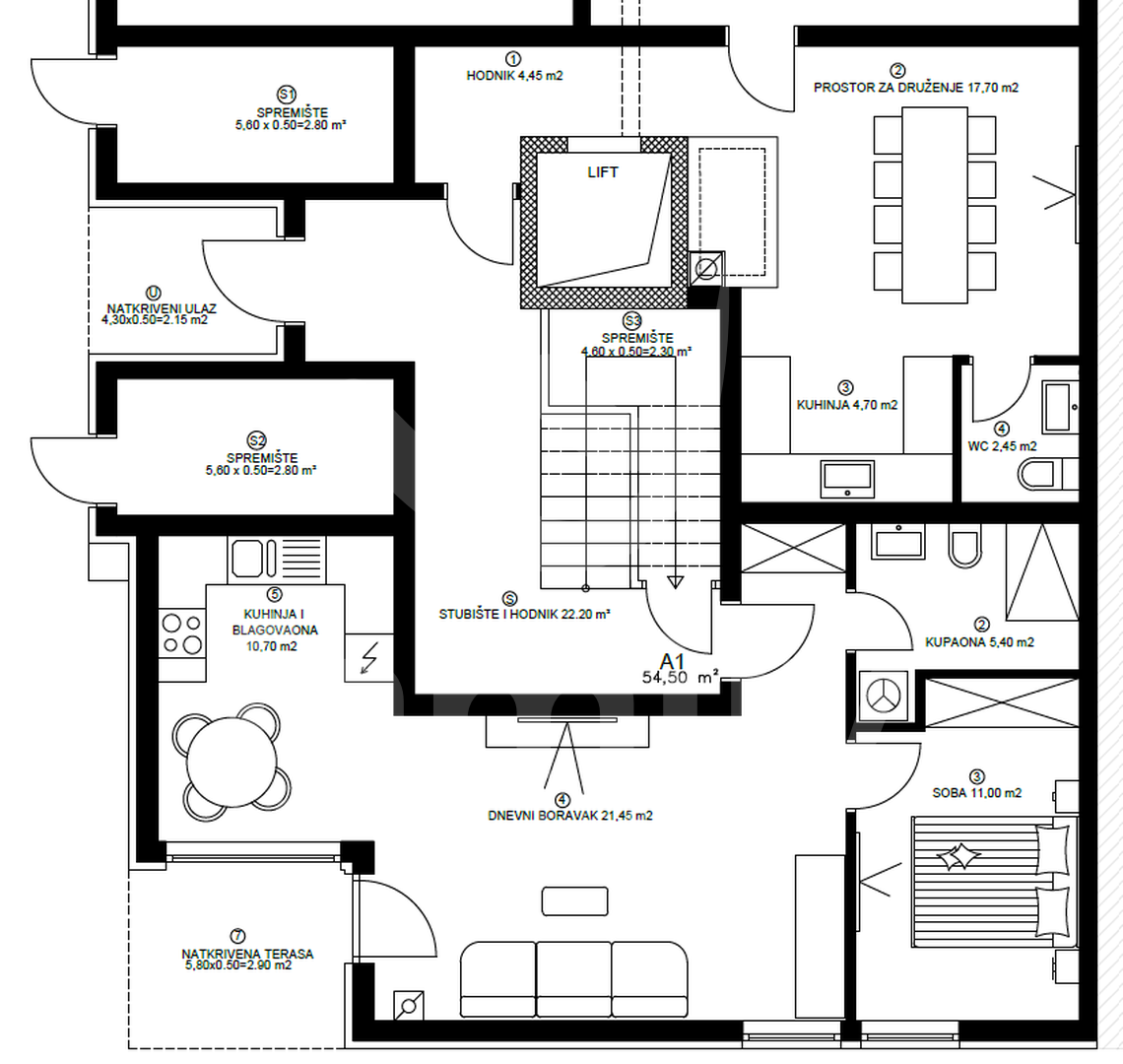 n za ugodan, kvalitetan i dugoročan život. U ponudi je moderno uređen jednosobni stan površine 54,50 m2, pametnog rasporeda, smješten na mirnoj lokaciji Pule. Prostor je funkcionalan, prozračan i osmišljen da pruži maksimalnu udobnost bez kompromisa. Stan se sastoji od ulaznog hodnika, otvorenog koncepta dnevnog boravka s kuhinjom i blagovaonicom, jedne spavaće sobe, kupaonice i natkrivene terase od 5,80 m2 - idealne za jutarnju kavu ili večernje opuštanje. Posebna pažnja posvećena je opremi i materijalima : - klima uređaji u dnevnom boravku i spavaćoj sobi - električno podno grijanje u dnevnom boravku, kuhinji, blagovaonici, hodniku i kupaonici - laminat u spavaćoj sobi, kvalitetne keramičke pločice u ostatku stana - električni podizači roleta na staklenoj stijeni u dnevnom boravku U cijenu stana uključeno je parking mjesto i ostava površine 2,80 m2. Planirani završetak radova je kraj godine, što budućem kupcu omogućuje mirno planiranje i sigurnu investiciju. Ovaj stan je savršen izbor za miran život blizu Pule, ali i kao kvalitetna investicija za dugoročni ili turistički najam. Svi bitni sadržaji poput trgovina, restorana, teretane, ljekarne i slično, u neposrednoj su blizini i dostupni su svega nekoliko minuta pješice. Moderna gradnja, funkcionalan raspored i tražena lokacija čine ga nekretninom koja zadržava vrijednost i nudi više od standarda. Ako tražite stan koji nije " još jedan u nizu ", već prostor s karakterom i smislom - ovo je prilika koju vrijedi pogledati. Za sve dodatne informacije nazovite na broj: + Marin Čude Asistent u posredovanju