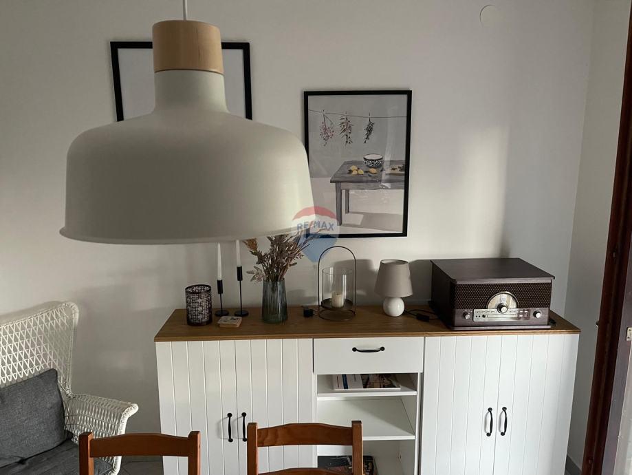 Kuća se sastoji od prizemlja i kata. U prizemlju se nalazi kuhinja,blagovaona, dnevni boravak s izlazom na terasu,jedna spavaća soba i jedna kupaonica. Tu su još i podrum i garaža od 21 m2.