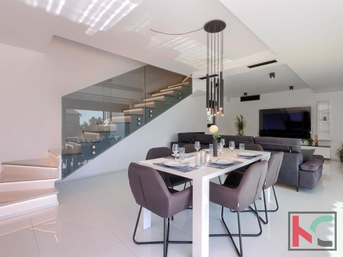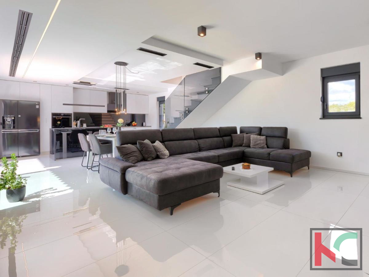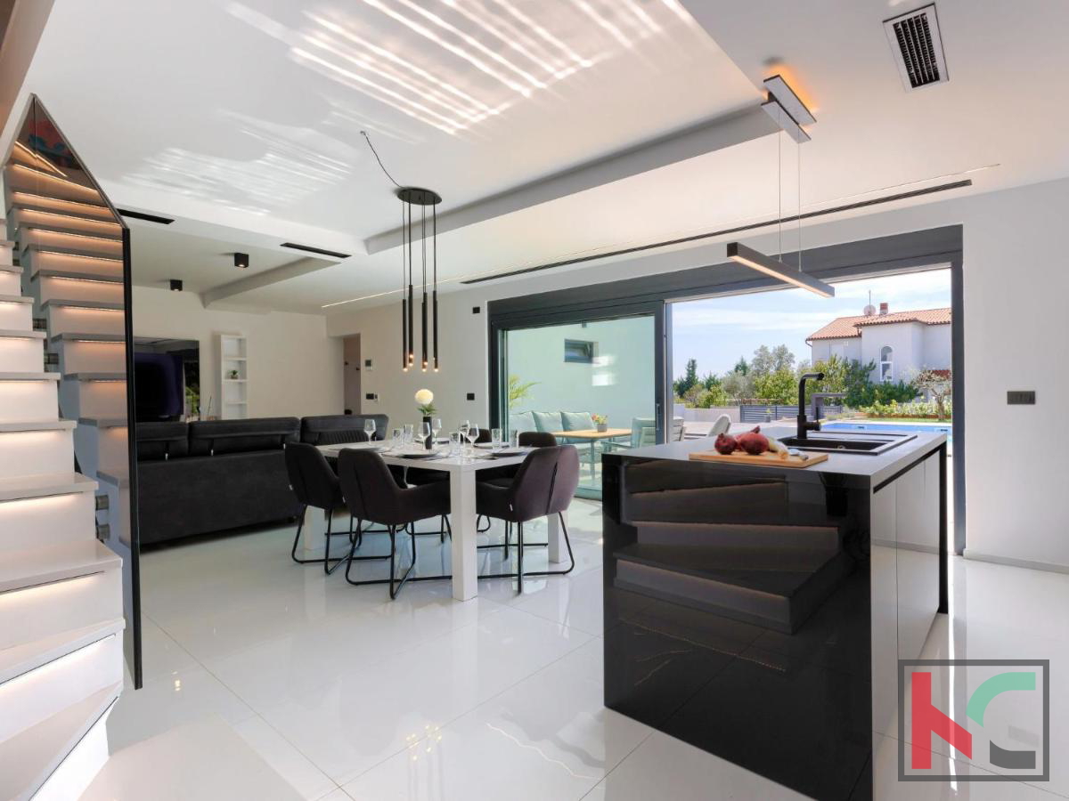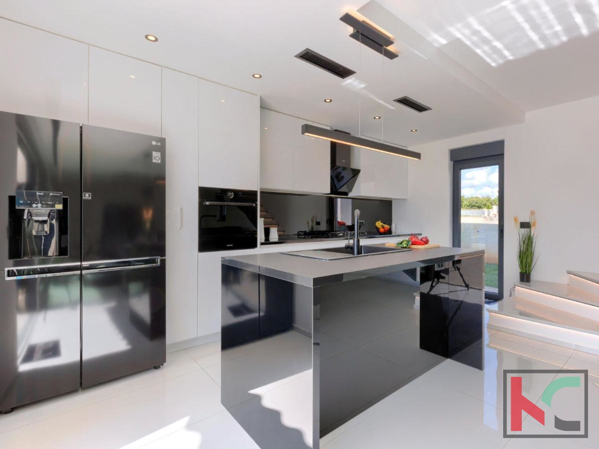 U mirnom mjestu nedaleko od Vodnjana smještena je ova predivna moderna vila koja nudi savršenu kombinaciju udobnosti, luksuza i privatnosti. Prostire se na 174 m2 stambene površine, okružena prostranom okućnicom od 666 m2, idealnom za opuštanje i uživanje u prirodnom okruženju. Prizemlje vile ima otvoreni koncept koji obuhvaća kuhinju, blagovaonicu i dnevni boravak, stvarajući prostran i svijetao prostor za druženje i obiteljske aktivnosti. Na ovoj razini nalaze se i hodnik, moderna kupaonica te garaža s izravnim ulazom u kuću. Prvi kat vile nudi tri prostrane spavaće sobe, od kojih dvije imaju vlastite walk-in ormare, savršene za organizaciju i dodatnu udobnost. Dvije luksuzno uređene kupaonice dodatno naglašavaju visoku kvalitetu interijera. Vila je opremljena najnovijim centralnim ventilacijskim sustavom grijanja i hlađenja koji omogućava brzo i učinkovito postizanje idealne temperature u svim prostorijama. Aluminijska stolarija osigurava dugotrajnost i visoku energetsku učinkovitost, dok su podovi obloženi prvoklasnim mramornim pločicama, što prostoru daje elegantan i profinjen izgled. Okućnica je pravo malo privatno utočište, s pažljivo osmišljenim vanjskim prostorom koji uključuje automatizirani bazen dimenzija 8x4 m. Bazen je obložen keramičkim mozaikom, opremljen protustrujnim plivanjem i epoksi fugama za jednostavno održavanje. Osim bazena, na okućnici je osigurano više parkirnih mjesta za goste, što ovu nekretninu čini savršenom i za okupljanja s prijateljima ili obitelji. Vodnjan je udaljen svega nekoliko minuta vožnje, dok su more i plaže na samo 8 km. Popularna turistička odredišta poput Pule (11 km) i Medulina (24 km) lako su dostupna, pružajući razne mogućnosti za rekreaciju, gastronomiju i uživanje u prirodnim ljepotama Istre. Ova nekretnina idealan je izbor za one koji traže luksuzni dom na atraktivnoj lokaciji, bilo za stalni boravak, odmor ili kao investiciju.