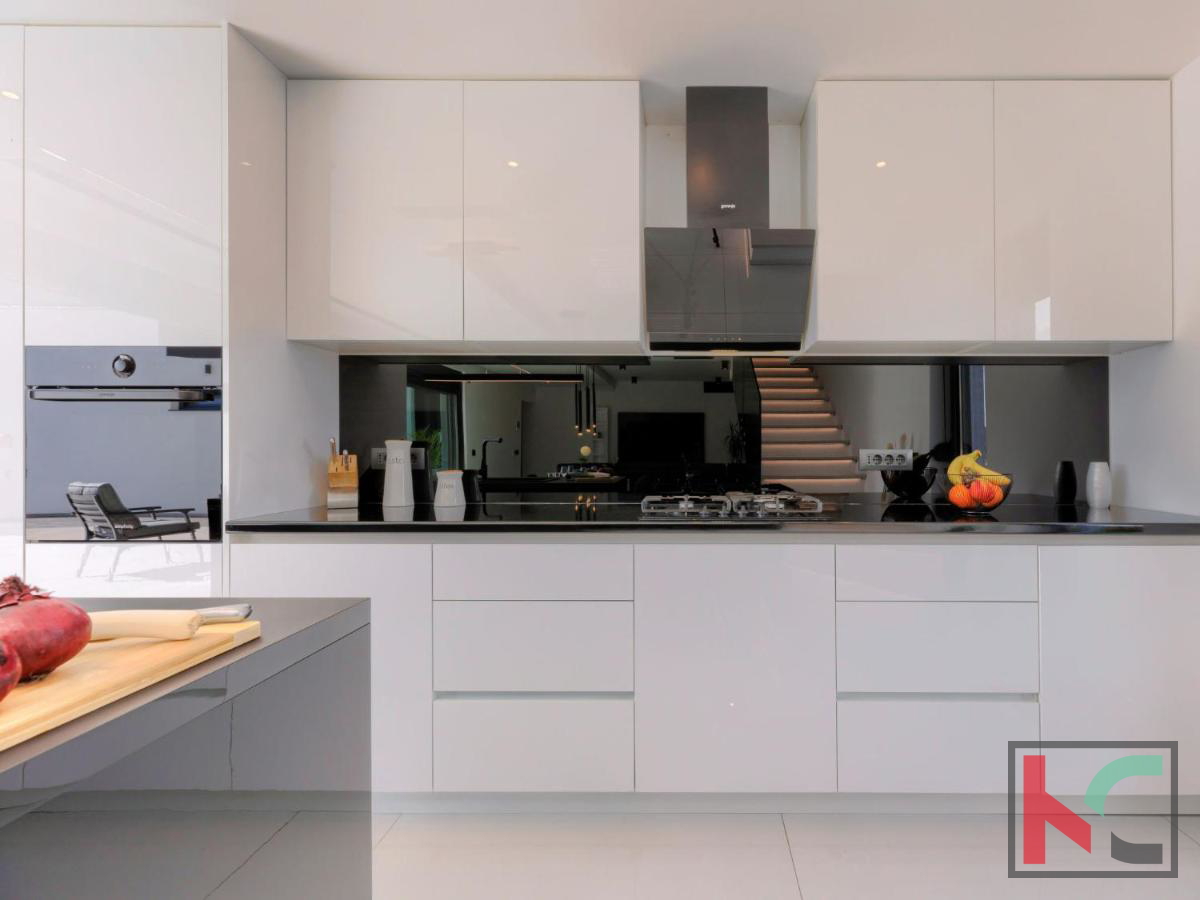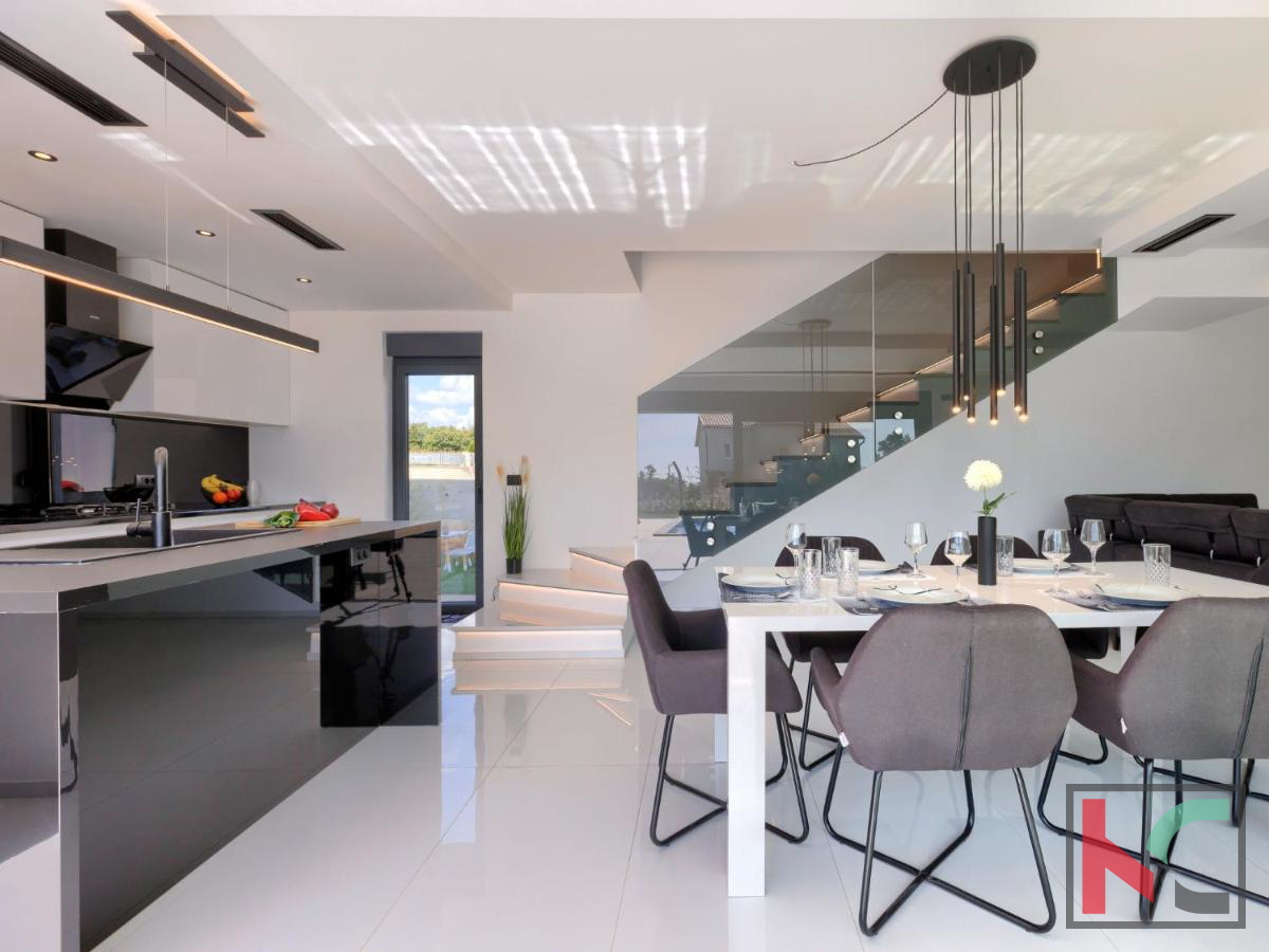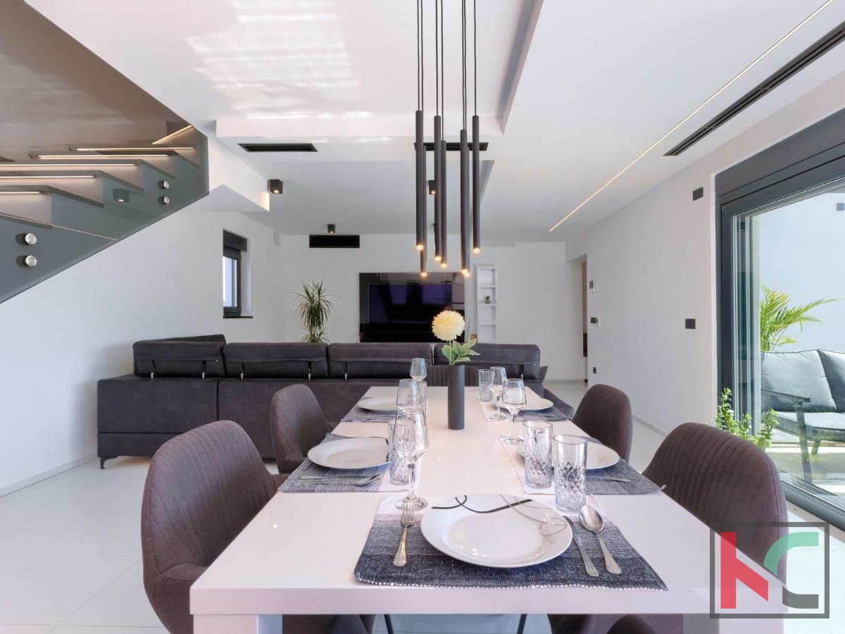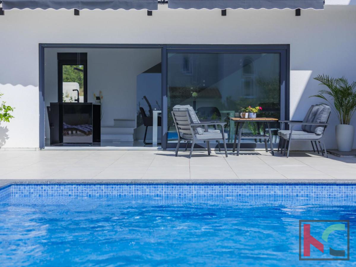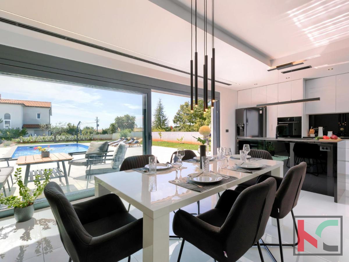 U mirnom mjestu nedaleko od Vodnjana smještena je ova predivna moderna vila koja nudi savršenu kombinaciju udobnosti, luksuza i privatnosti. Prostire se na 174 m2 stambene površine, okružena prostranom okućnicom od 666 m2, idealnom za opuštanje i uživanje u prirodnom okruženju. Prizemlje vile ima otvoreni koncept koji obuhvaća kuhinju, blagovaonicu i dnevni boravak, stvarajući prostran i svijetao prostor za druženje i obiteljske aktivnosti. Na ovoj razini nalaze se i hodnik, moderna kupaonica te garaža s izravnim ulazom u kuću. Prvi kat vile nudi tri prostrane spavaće sobe, od kojih dvije imaju vlastite walk-in ormare, savršene za organizaciju i dodatnu udobnost. Dvije luksuzno uređene kupaonice dodatno naglašavaju visoku kvalitetu interijera. Vila je opremljena najnovijim centralnim ventilacijskim sustavom grijanja i hlađenja koji omogućava brzo i učinkovito postizanje idealne temperature u svim prostorijama. Aluminijska stolarija osigurava dugotrajnost i visoku energetsku učinkovitost, dok su podovi obloženi prvoklasnim mramornim pločicama, što prostoru daje elegantan i profinjen izgled. Okućnica je pravo malo privatno utočište, s pažljivo osmišljenim vanjskim prostorom koji uključuje automatizirani bazen dimenzija 8x4 m. Bazen je obložen keramičkim mozaikom, opremljen protustrujnim plivanjem i epoksi fugama za jednostavno održavanje. Osim bazena, na okućnici je osigurano više parkirnih mjesta za goste, što ovu nekretninu čini savršenom i za okupljanja s prijateljima ili obitelji. Vodnjan je udaljen svega nekoliko minuta vožnje, dok su more i plaže na samo 8 km. Popularna turistička odredišta poput Pule (11 km) i Medulina (24 km) lako su dostupna, pružajući razne mogućnosti za rekreaciju, gastronomiju i uživanje u prirodnim ljepotama Istre. Ova nekretnina idealan je izbor za one koji traže luksuzni dom na atraktivnoj lokaciji, bilo za stalni boravak, odmor ili kao investiciju.