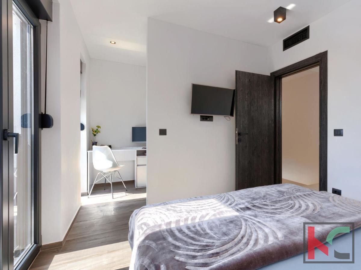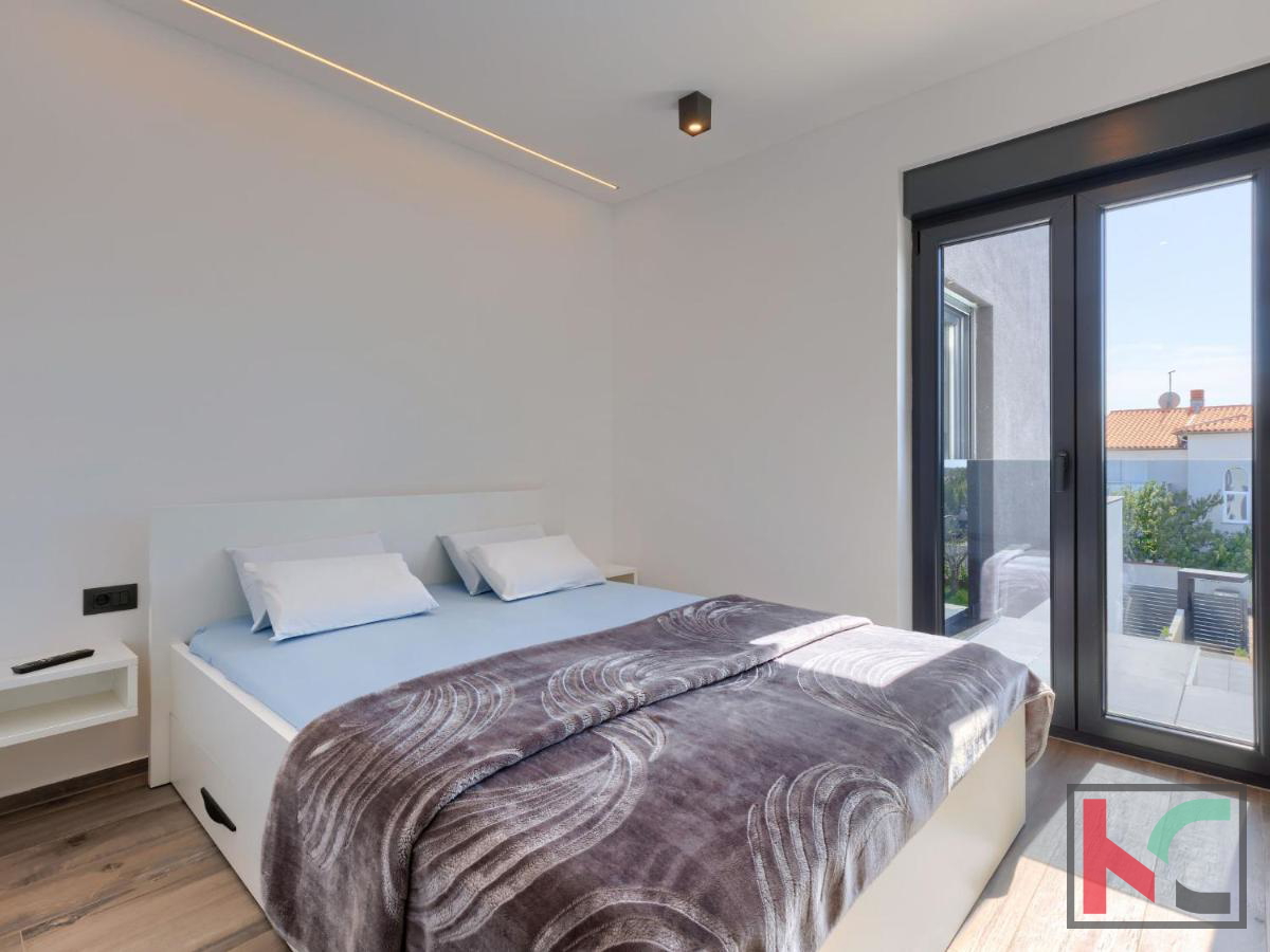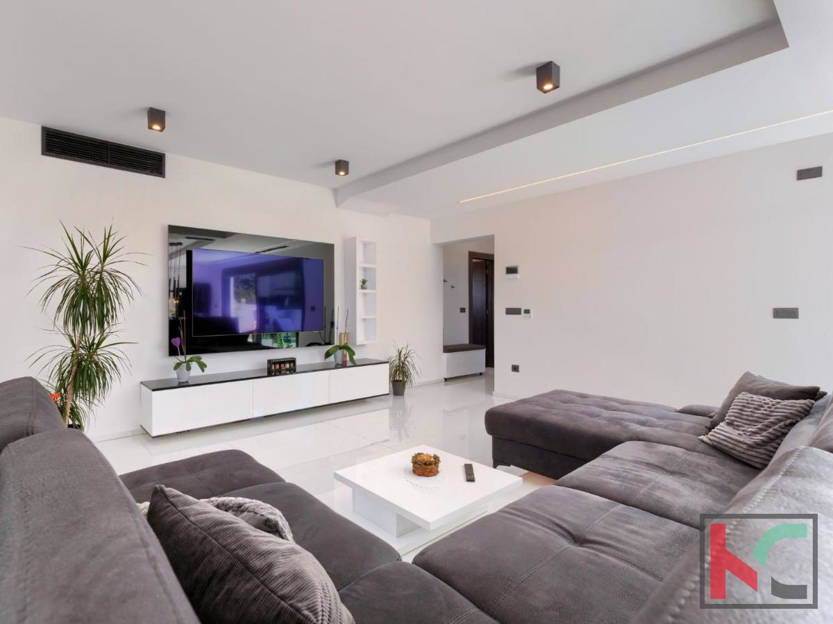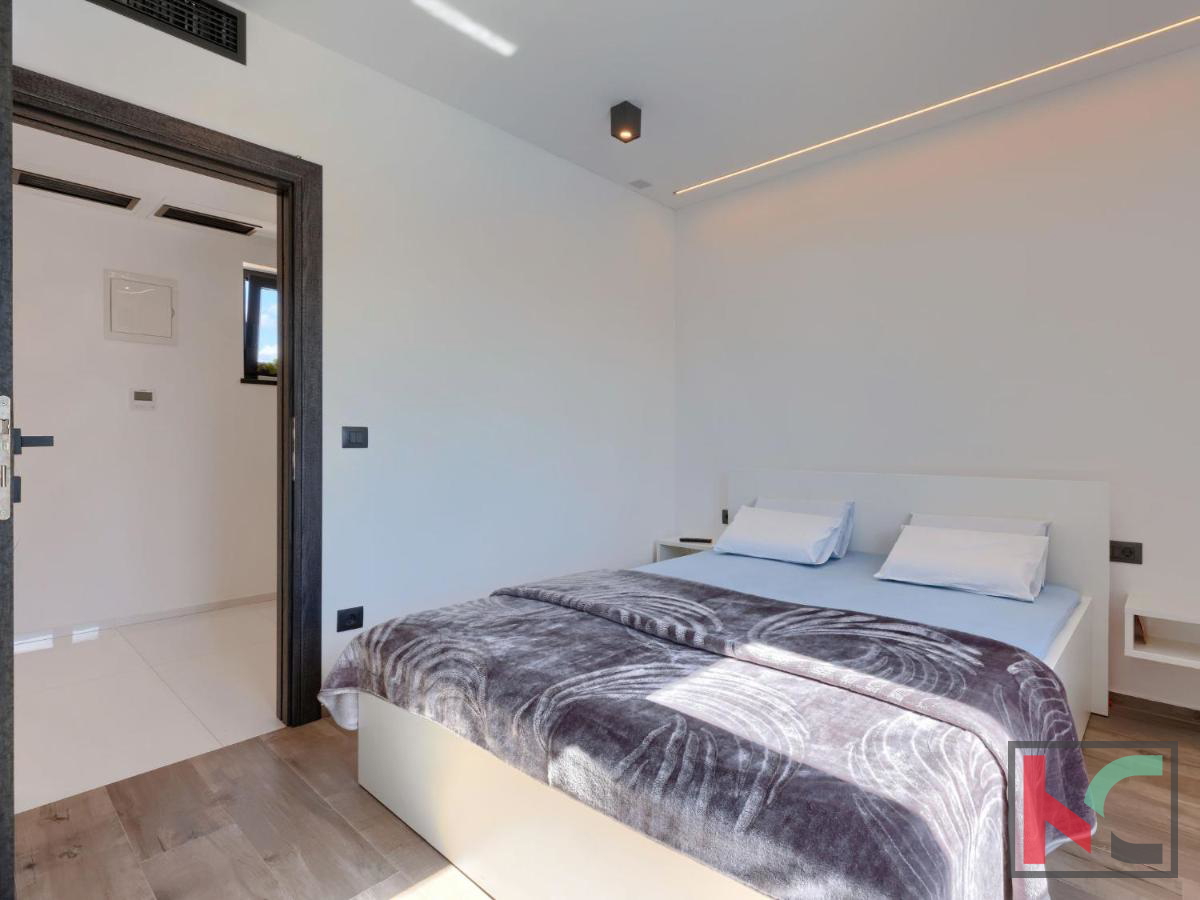 U mirnom mjestu nedaleko od Vodnjana smještena je ova predivna moderna vila koja nudi savršenu kombinaciju udobnosti, luksuza i privatnosti. Prostire se na 174 m2 stambene površine, okružena prostranom okućnicom od 666 m2, idealnom za opuštanje i uživanje u prirodnom okruženju. Prizemlje vile ima otvoreni koncept koji obuhvaća kuhinju, blagovaonicu i dnevni boravak, stvarajući prostran i svijetao prostor za druženje i obiteljske aktivnosti. Na ovoj razini nalaze se i hodnik, moderna kupaonica te garaža s izravnim ulazom u kuću. Prvi kat vile nudi tri prostrane spavaće sobe, od kojih dvije imaju vlastite walk-in ormare, savršene za organizaciju i dodatnu udobnost. Dvije luksuzno uređene kupaonice dodatno naglašavaju visoku kvalitetu interijera. Vila je opremljena najnovijim centralnim ventilacijskim sustavom grijanja i hlađenja koji omogućava brzo i učinkovito postizanje idealne temperature u svim prostorijama. Aluminijska stolarija osigurava dugotrajnost i visoku energetsku učinkovitost, dok su podovi obloženi prvoklasnim mramornim pločicama, što prostoru daje elegantan i profinjen izgled. Okućnica je pravo malo privatno utočište, s pažljivo osmišljenim vanjskim prostorom koji uključuje automatizirani bazen dimenzija 8x4 m. Bazen je obložen keramičkim mozaikom, opremljen protustrujnim plivanjem i epoksi fugama za jednostavno održavanje. Osim bazena, na okućnici je osigurano više parkirnih mjesta za goste, što ovu nekretninu čini savršenom i za okupljanja s prijateljima ili obitelji. Vodnjan je udaljen svega nekoliko minuta vožnje, dok su more i plaže na samo 8 km. Popularna turistička odredišta poput Pule (11 km) i Medulina (24 km) lako su dostupna, pružajući razne mogućnosti za rekreaciju, gastronomiju i uživanje u prirodnim ljepotama Istre. Ova nekretnina idealan je izbor za one koji traže luksuzni dom na atraktivnoj lokaciji, bilo za stalni boravak, odmor ili kao investiciju.