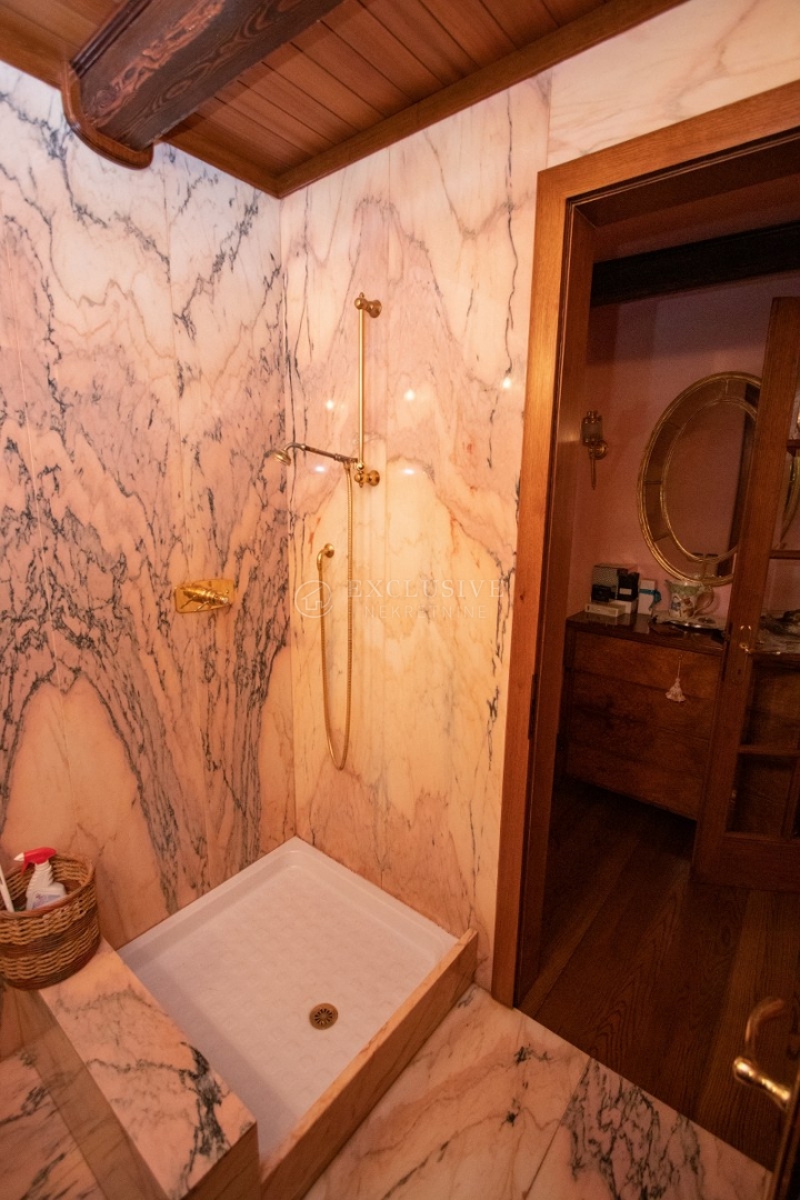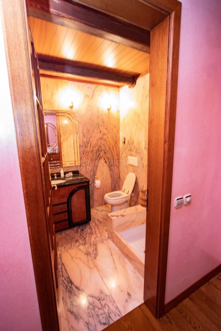 The apartment has been completely luxuriously renovated, using top-quality materials and equipment (external and internal joinery and decorations are made of solid oak and mahogany; a ceiling with visible wooden beams, as well as a living room with a fireplace in the central hall, gives a special charm; kitchens with a central island and granite worktops are fitted with high-class equipment; bathrooms are lined with top-quality marble; ... ).