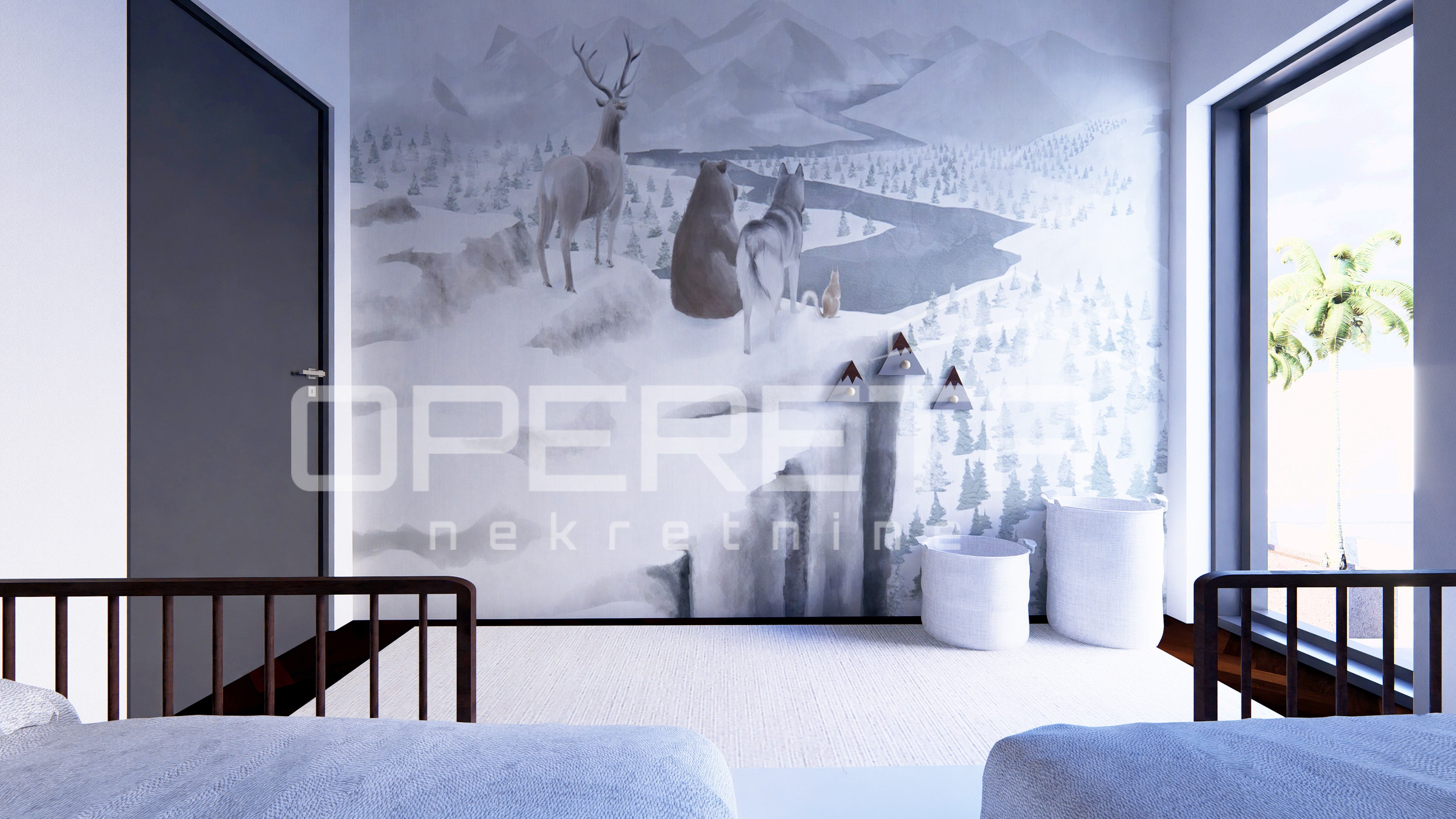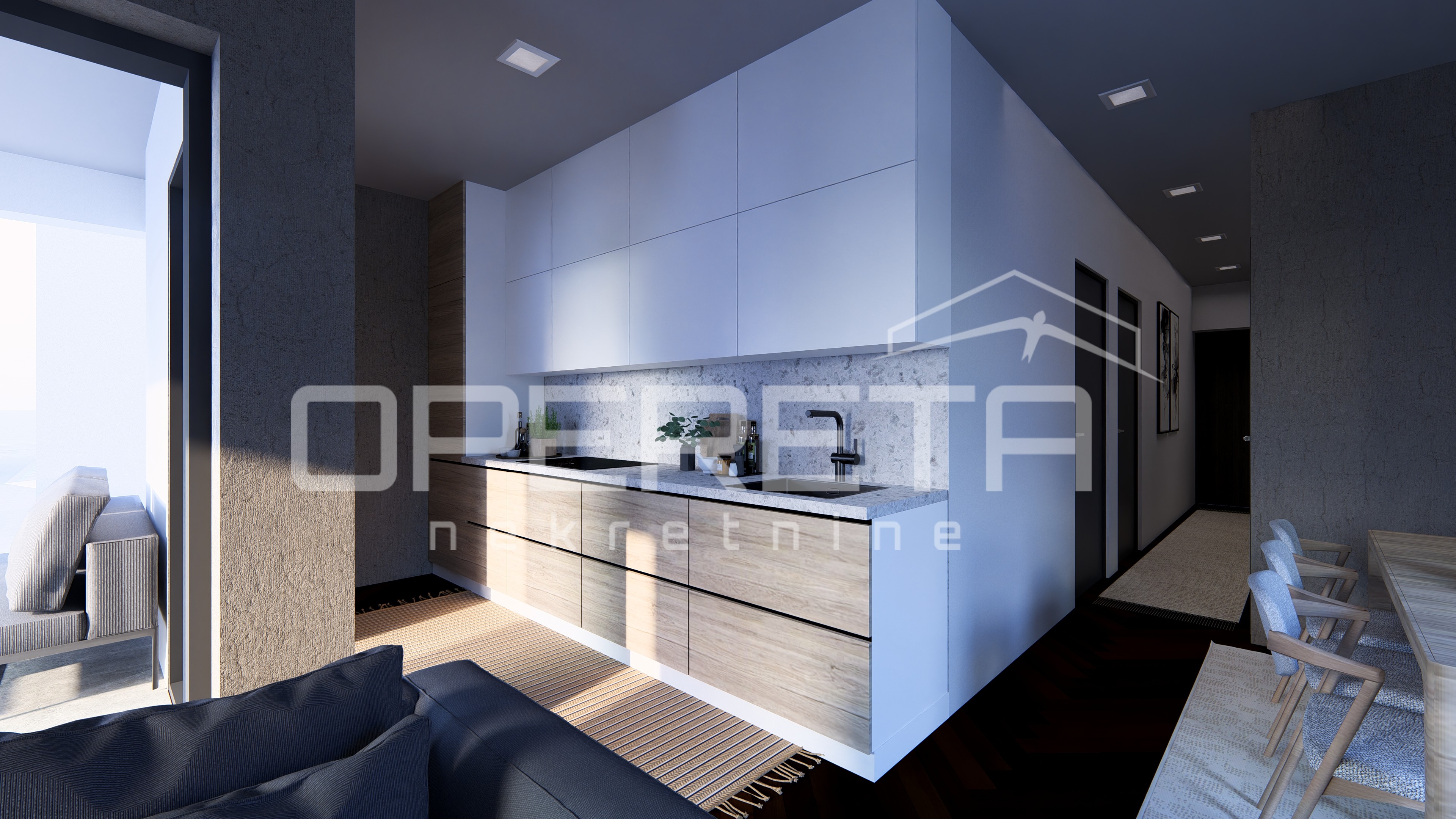 Raspored uključuje open space kuhinju s blagovaonicom i dnevnim boravkom, obogaćenim velikim staklenim stijenama koje omogućuju obilje prirodnog svjetla. Stan također ima dvije spavaće sobe, jednu kupaonicu te dodatni odvojeni WC.