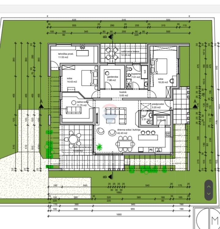 vaonicom, 3 spavaće sobe, jednu kupaonicu, jedan WC, garderobu, 2 natkrivene terase, ostavu i tehničku prostoriju.