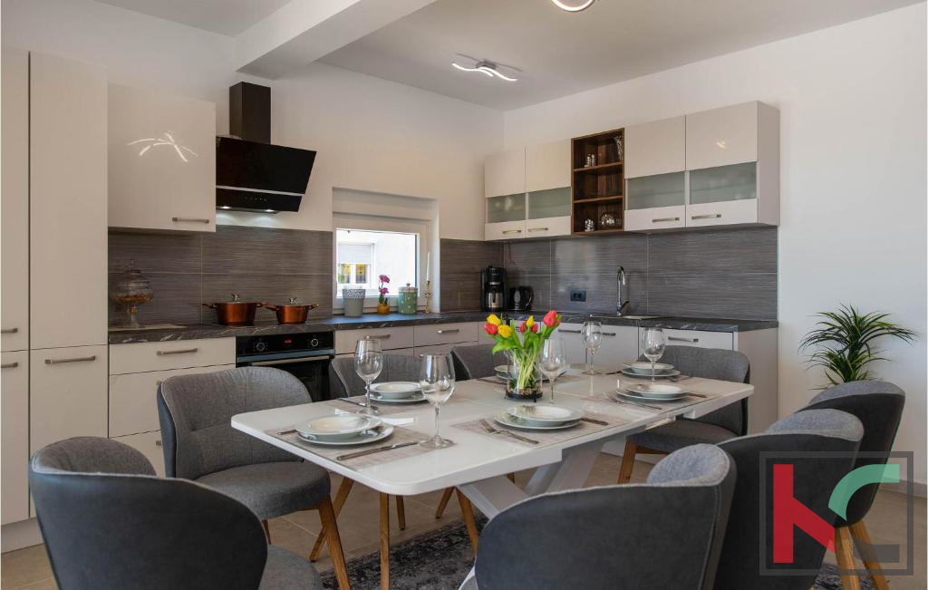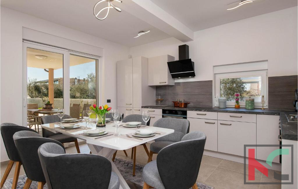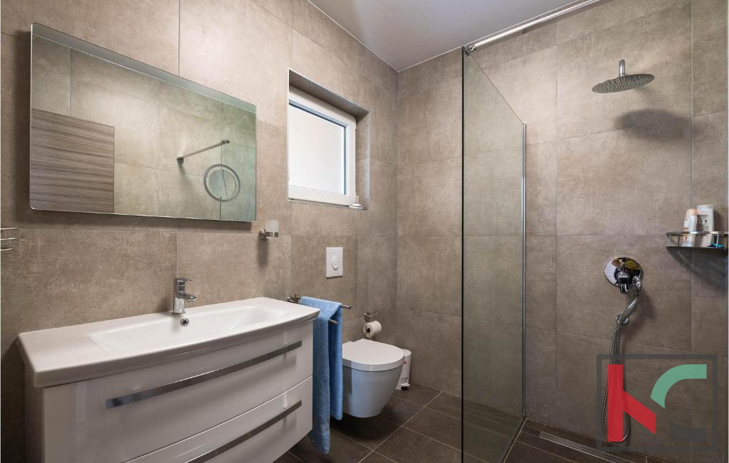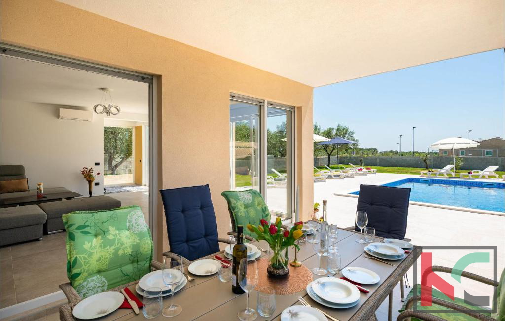 U mirnom dijelu Vodnjana u slijepoj ulici smještena je ova suvremena vila na parceli od m2, s otvorenim pogledom na istarski krajolik, more i otočje Brijuna. Povišena pozicija osigurava privatnost i mir, uz blizinu svih potrebnih sadržaja. Vila nudi prostran, svijetao interijer s dnevnim boravkom povezanom s terasom i vrtom, modernu kuhinju s blagovaonicom te četiri spavaće sobe, od koje su tri na prvom katu, svaku s vlastitom kupaonicom i pogledom na more. Terase na katu dodatno naglašavaju ekskluzivnost ove nekretnine. Uređena i ograđena okućnica uključuje bazen od 28 m2, sunčalište, roštilj zonu, dječje igralište i mediteranski vrt s maslinama. Na ulazu u parcelu predviđen je pomoćni objekt od 30 m2 u roh-bau fazi sa mogućnosti uređenja po želji budućeg vlasnika. Nekretnina savršena za luksuzni odmor, stanovanje ili sigurnu investiciju.