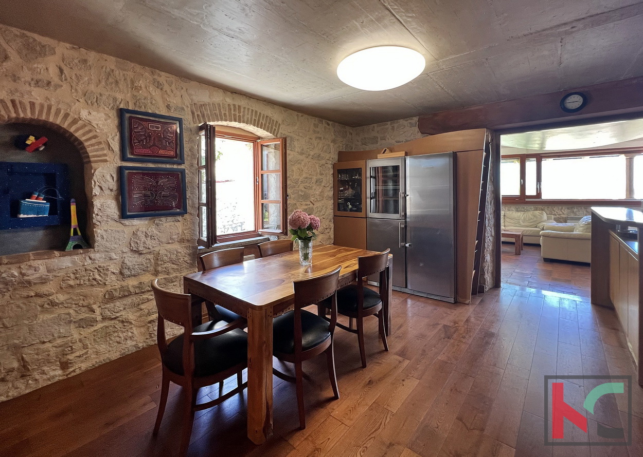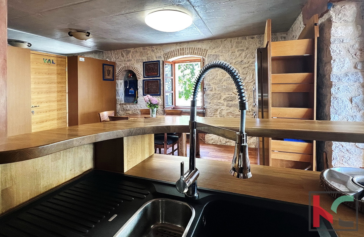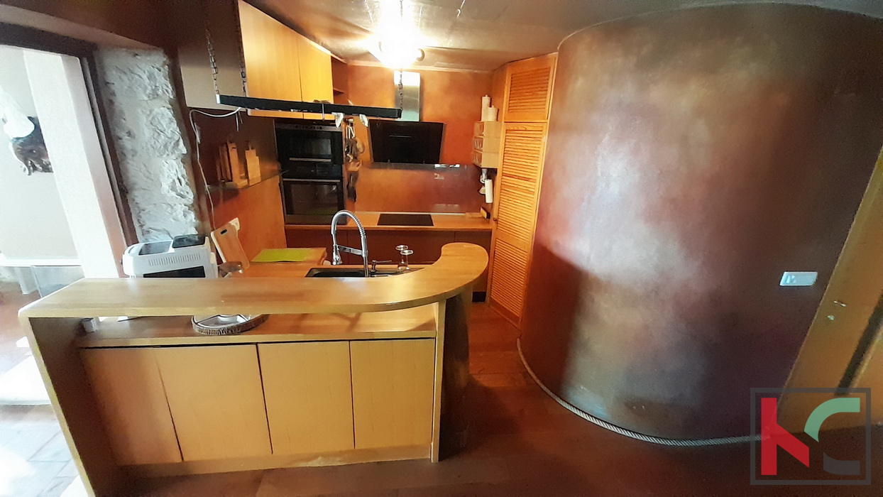 Funtana je šarmantno ribarsko mjesto smješteno između Poreča i Vrsara, poznato po opuštenoj mediteranskoj atmosferi, uređenim plažama i vrhunskoj gastronomskoj ponudi. Idealna je za miran obiteljski život tijekom cijele godine, ali i kao atraktivna turistička destinacija s velikim interesom gostiju tijekom sezone. Blizina mora, kampova, biciklističkih staza i svih potrebnih sadržaja čini Funtanu izvrsnim izborom za stanovanje, odmor ili investiciju u turistički najam. Na prodaju je obnovljena stambeno poslovna dvojnica (nekada dvije kuće) smještena u samom centru Funtane, na iznimno atraktivnoj lokaciji koja omogućuje lagodan život na korak od svih sadržaja – trgovina, restorana, mora i svakodnevnih potreba. Rekonstruirana je po restauratorskim principima i pretvorena u samostojeću kuću pri čemu je zadržan duh tradicijske građanske kuće sa naglaskom na atraktivni izgled interijera i eksterijera. Prednost ove kuće su dva odvojena ulaza u stambeni i poslovni dio. Sam stambeni dio ima ulaz sa malog atraktivnog dvorišta na istočnoj strani raspoređeno u tri etaže (pr+kat+pot) od ukupno 145 m2. Sastoji se od ulaznog dijela, stepeništa, kuhinje sa blagovaonom iu komunikaciji sa dnevnim boravkom, toalet, spavaće sobe te u potkrovlju još dvije spavaće sobe i kupaonica. Posebnu vrijednost stambenog prostora ima prostrani dnevni boravak koji je u potpunosti ostakljen, okupan prirodnim svjetlom tijekom cijelog dana. Iz boravka se pruža prekrasan, otvoren pogled koji prostoru daje osjećaj prozračnosti, topline i ugode – idealno mjesto za opuštanje i druženje. U prizemlju nalazi studio apartman od 29m2 registriran kao poslovni prostor i može se koristiti za neke tihe djelatnosti (ali nije uvjet) što omogućava ugodan obiteljski život uz mogućnost dodatnih prihoda na istoj lokaciji. Sav namještaj i detalji interijera specijalno su izrađeni te su sastavni dio cijene, osim privatnih memorabilija i umjetnina. Kuća odiše ugodnom atmosferom te predstavlja odličan izbor za obiteljski život, kuću za odmor ili investiciju u turistički najam, upravo zahvaljujući svojoj centralnoj lokaciji i specifičnom ambijentu. Ova jedinstvena nekretnina odiše arhitektonskim štihom staro/nove Istarske tradicije te je unikatna prilika za nove vlasnike sa umjetničkim senzibilitetom.