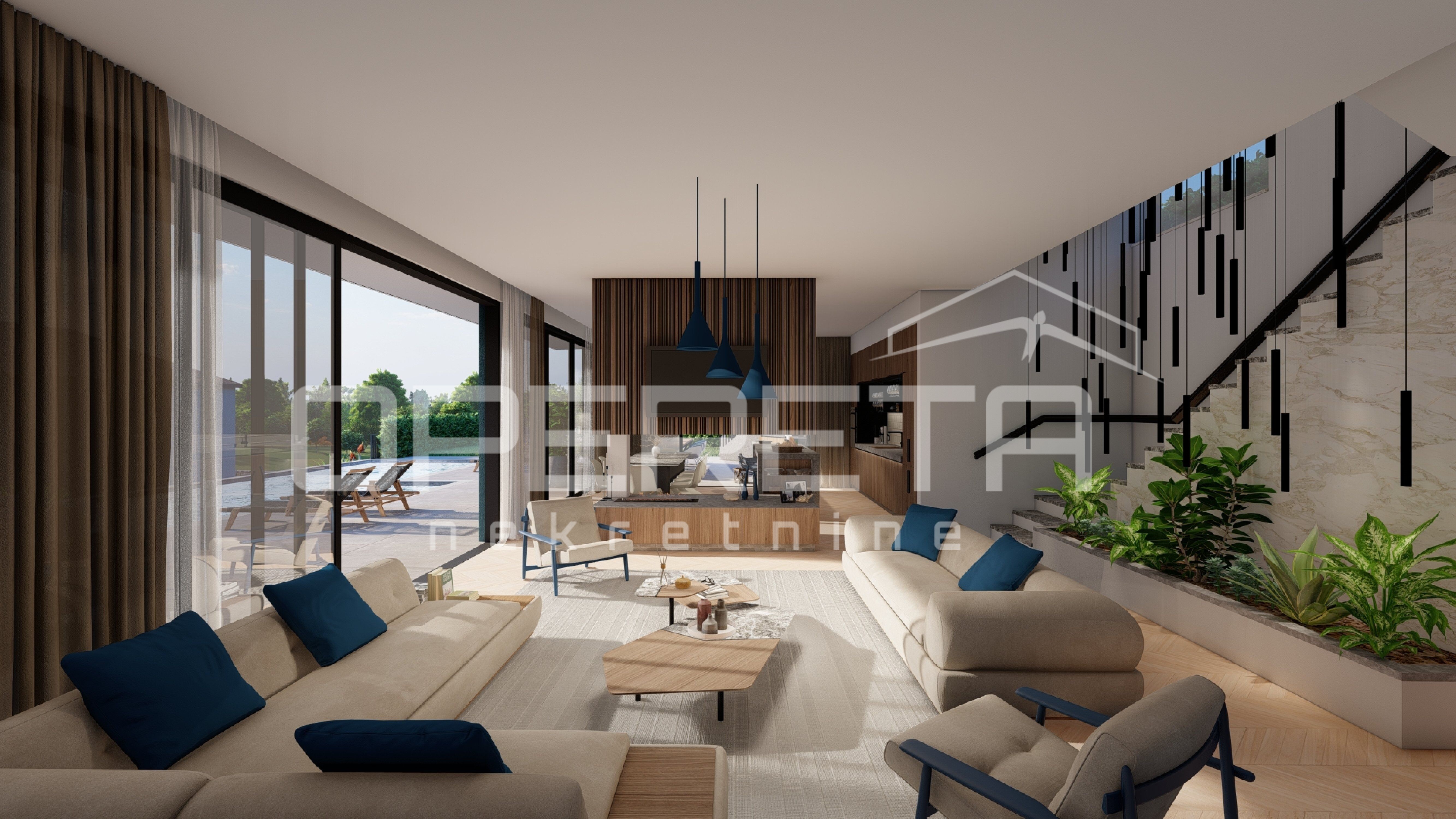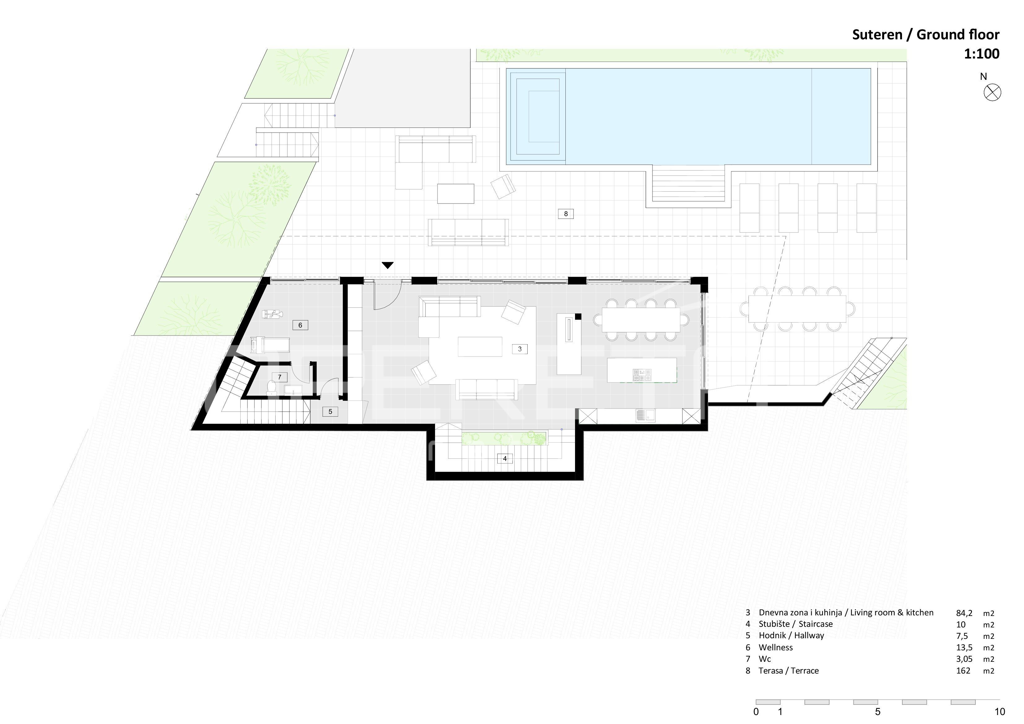 U prizemlju se nalazi prostrani dnevni boravak povezan s kuhinjom i blagovaonicom u otvorenom konceptu, idealan za druženje i opuštanje. U ovoj etaži smještena je i elegantna wellness zona, dodatni toalet, te izlaz na natkrivenu terasu ispred koje se nalazi veliki bazen s ugrađenim jacuzzijem – savršeno mjesto za uživanje u mediteranskom okruženju.