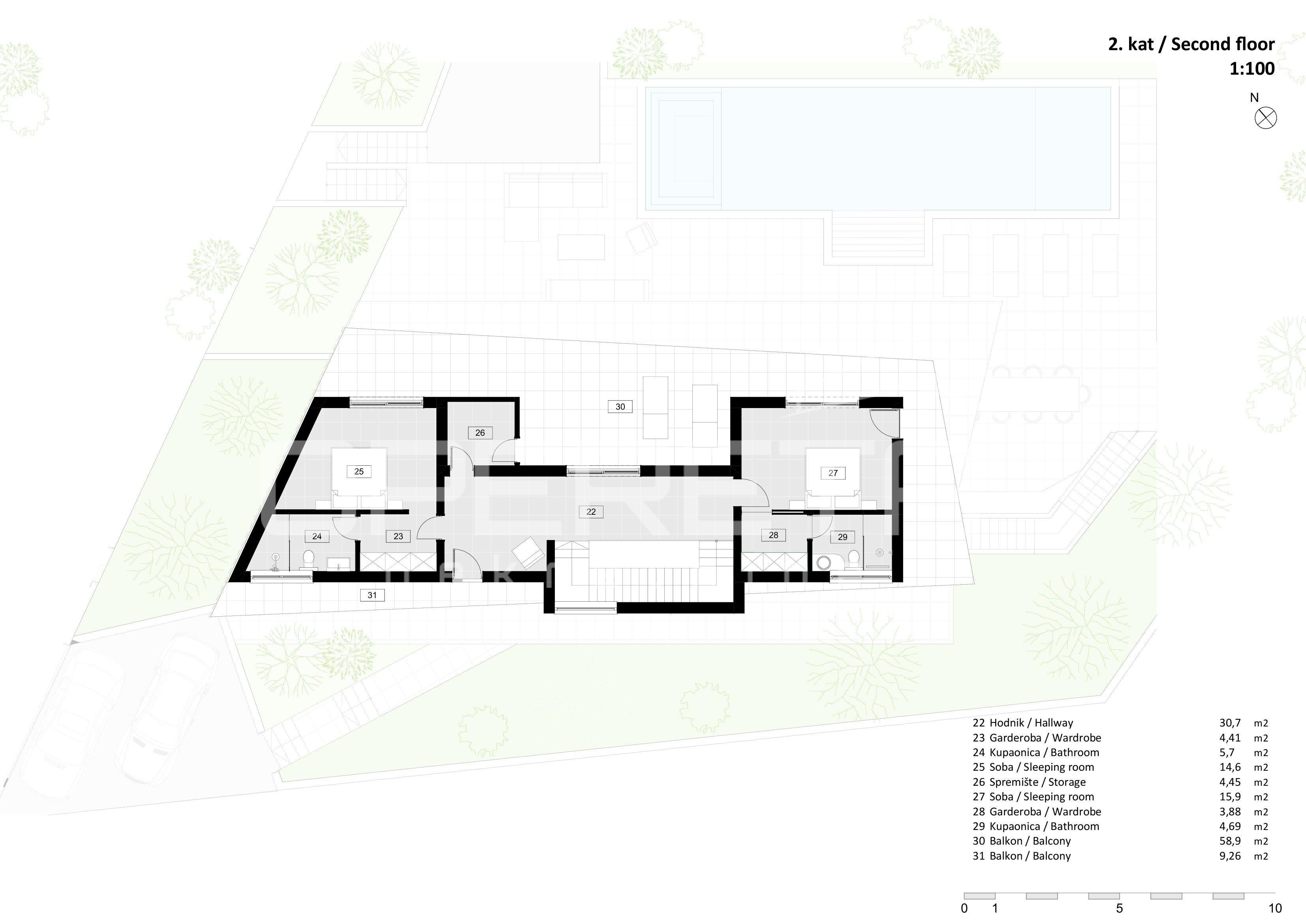 Na drugom katu smještene su dvije master spavaće sobe, obje s vlastitim kupaonicama, walk-in garderobama i izlazima na privatne balkone s kojih se pruža očaravajući pogled.