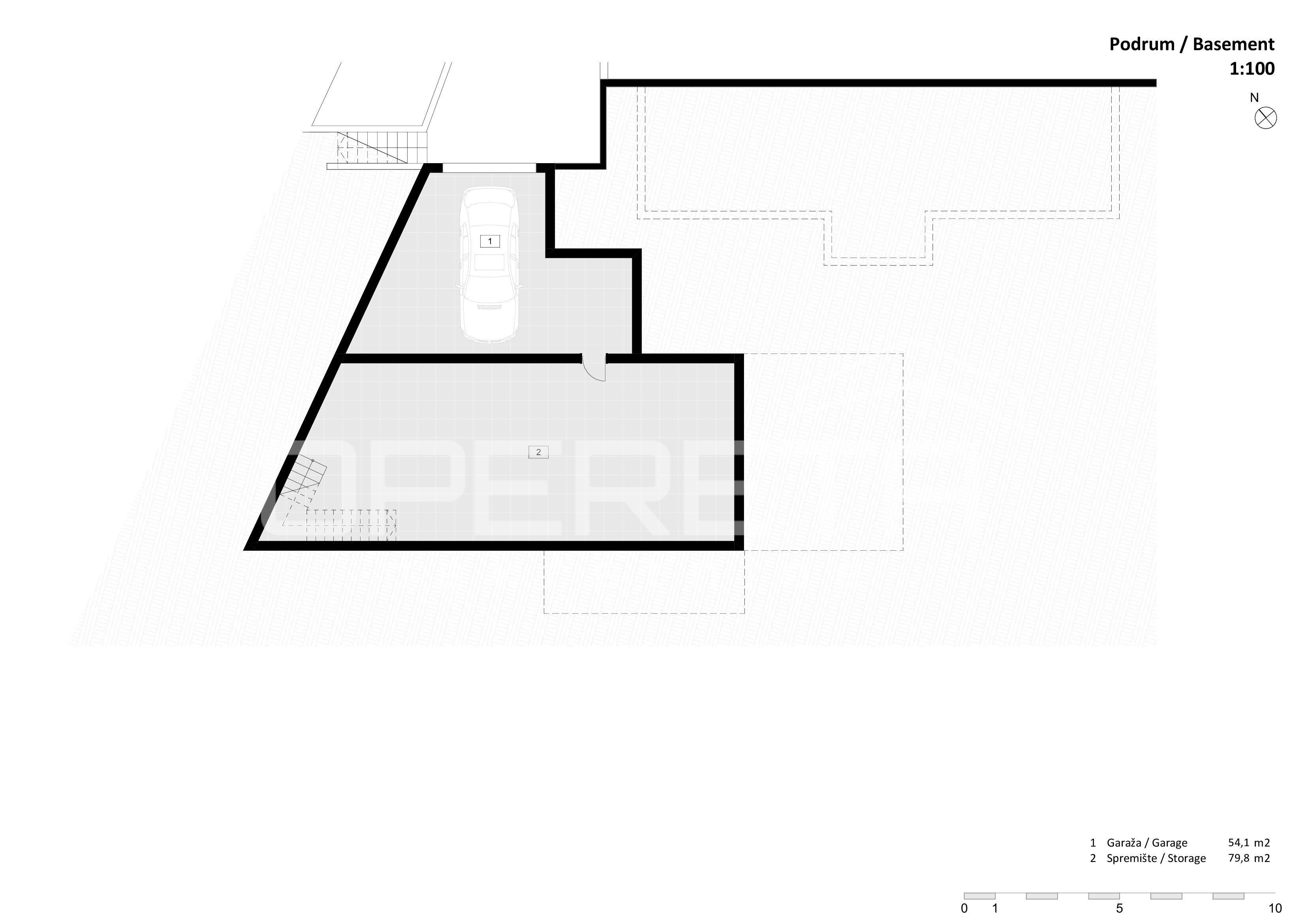 Suteren obuhvaća garažu i spremište, pružajući dovoljno prostora za vozila i dodatnu opremu.