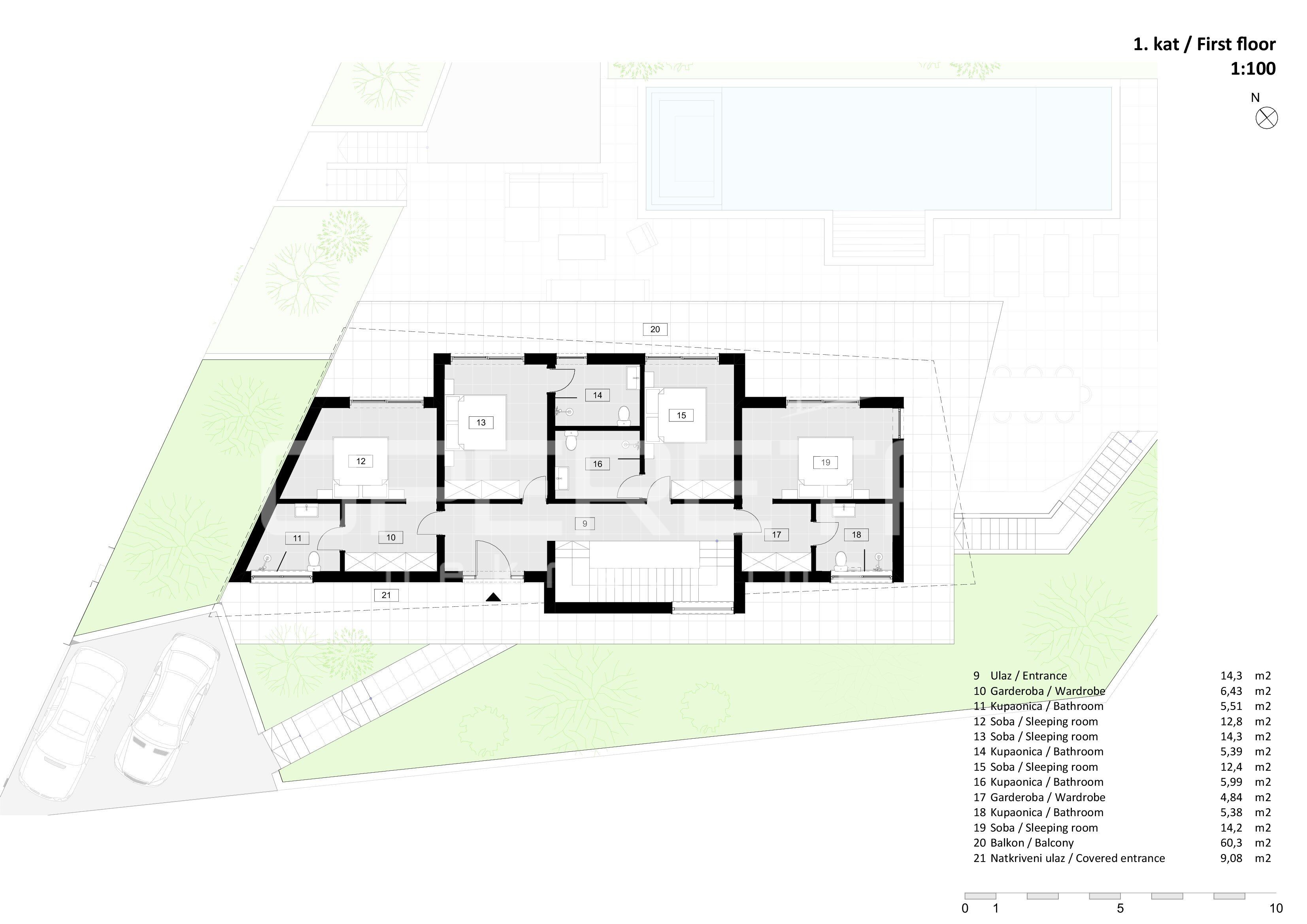 Unutarnje stubište vodi na prvi kat, gdje se nalaze četiri prostrane spavaće sobe, svaka sa vlastitom kupaonicom, garderobom i terasom, što pruža iznimnu razinu privatnosti i komfora.