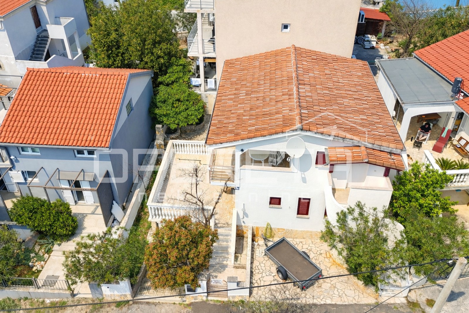 U mirnoj ulici, svega 200 m od mora, smjestila se samostojeća kuća podijeljena u dvije stambene jedinice, s vlastitom garažom, uređenim dvorištem i pogledom na more s gornje etaže.