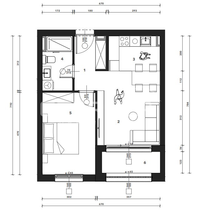 Sastoji se od ulaznog hodnika, kuhinje s blagovaonicom i dnevnog boravka, spavaće sobe, kupaonice i loggie. Uz stan je potrebno kupiti gar