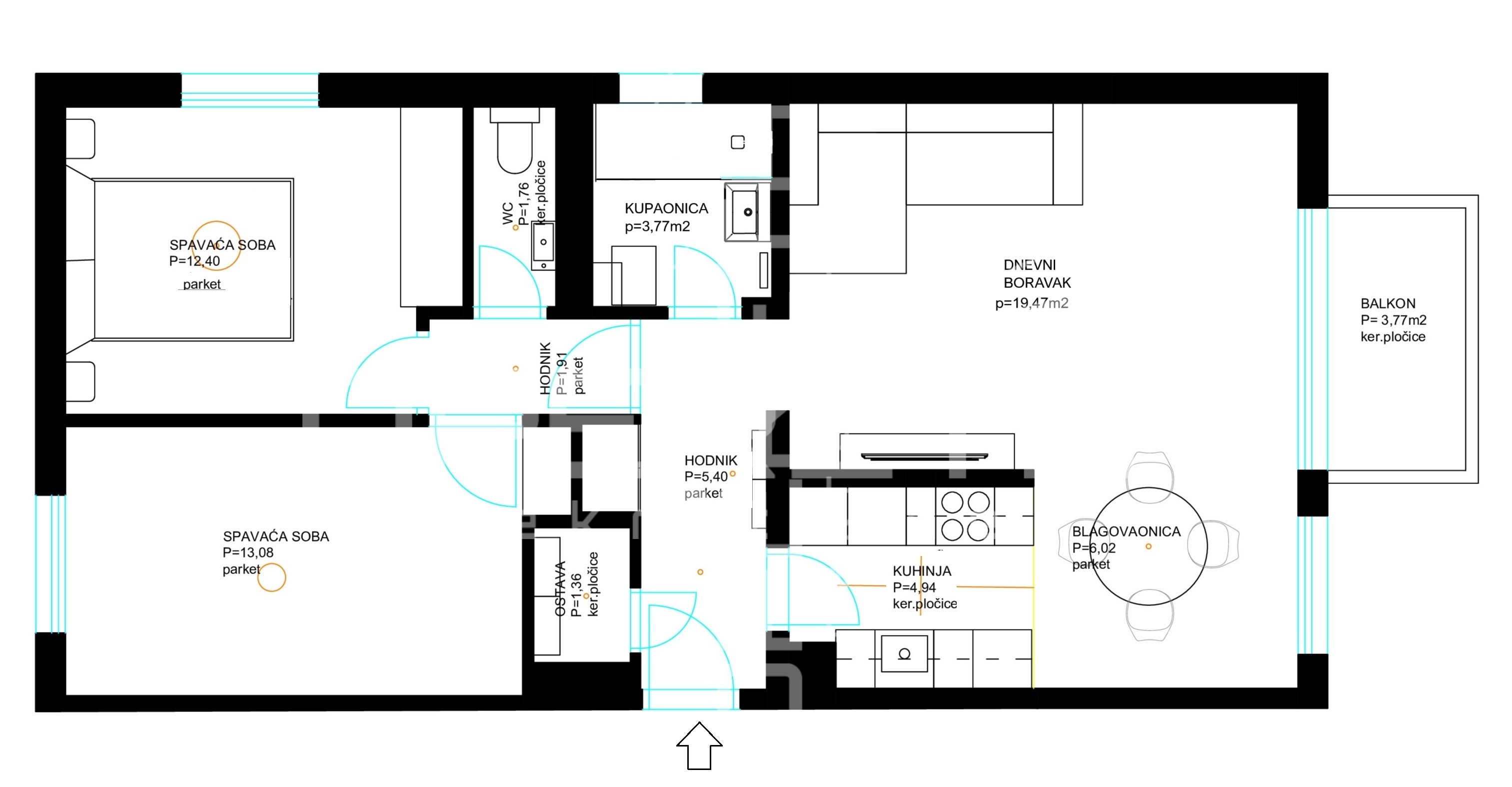 - Površina balkona: 3,77 m2