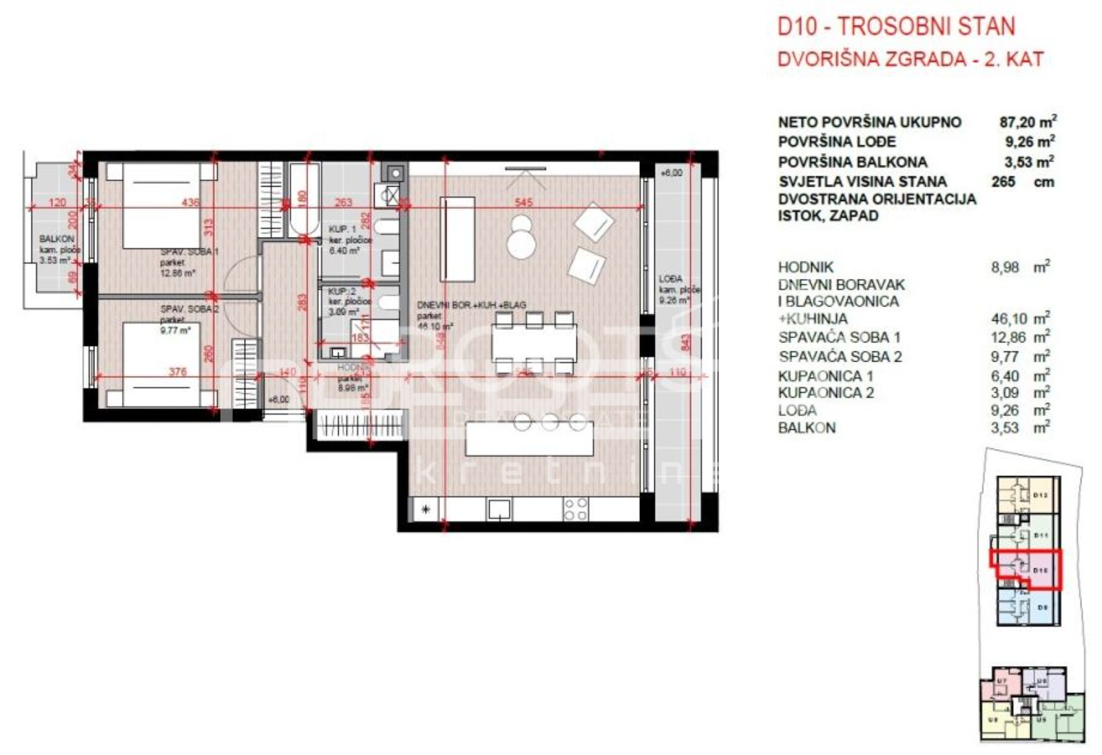 Stan D10 je smješten na prvom katu ukupne površinu 95m². Sastoji se od ulaznog hodnika, open space boravka s kuhinjom i blagovaonicom, dvije spavaće sobe, dvije kupaonice, balkon i lođa.