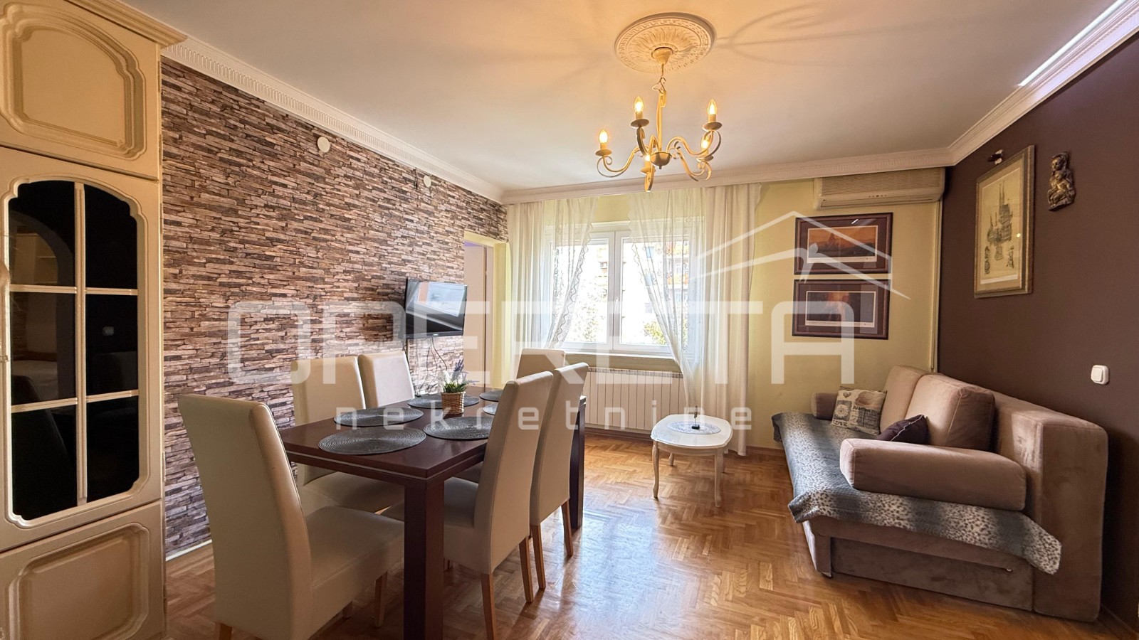avka s blagovaonicom, kuhinje, 2 spavaće sobe od kojih je jedna manja te ima izlaz na zatvorenu lođu, kupaonice s WC-om, ostave i vešeraja. Stan je kompletno uređen i adaptiran 2023. godine dok je zgrada obnovljena i posjeduje energetski certifikat A+.