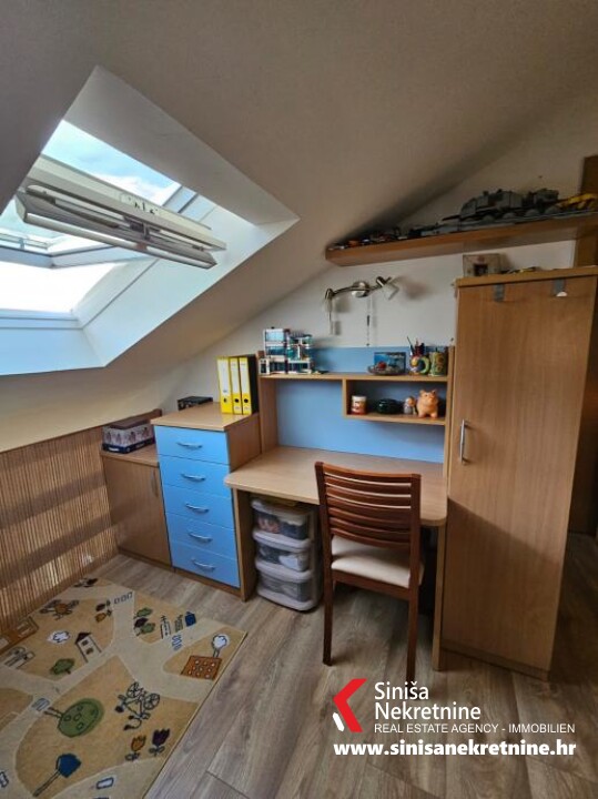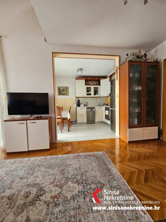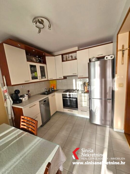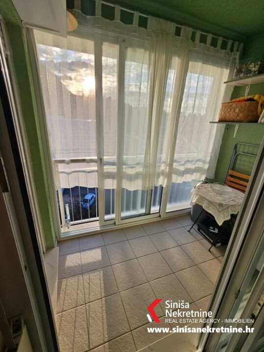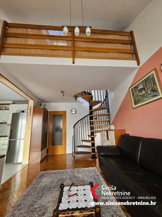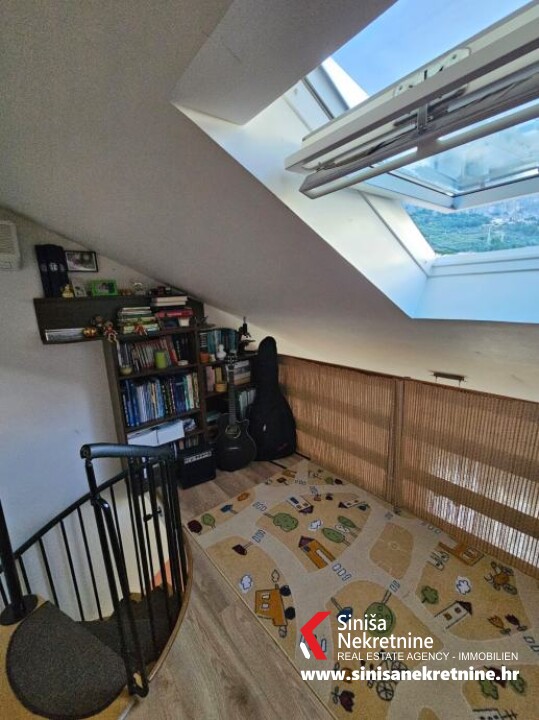 onjoj etaži se nalazi hodnik, jedna kupaonica, kuhinja, blagavaonica i dnevni boravak, te ostakljena lođa koja pruža lijep pogled na more. Na gornjoj etaži (potkrovlje) se nalazi galerija koja se može po potrebi koristiti kao radna soba, dvije spavaće sobe i kupaonica. Stan je potpuno namješten i kao takav je predmet prodaje. Izvrsna lokacija u zapadnom dijelu grada, u neposrednoj blizini se nalaze škola, vrtić i trgovine. Udaljenost od mora i plaže je 500m. Ispred zgrade se nalazi zajednički parking za stanare. Stanu također pripada i ostava u podrumu zgrade. Mogućnost kupnje privatnog parkirnog mjesta u garaži. Svi papiri uredni 1/1