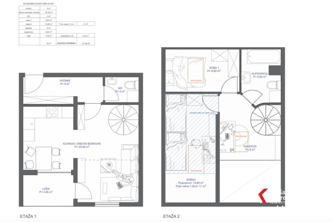 U ponudi nudimo namješten dvoetažni stan na trećem katu stambene zgrade. Stan je ukupne korisne površine od 71m2, neto površina 64m2, sastoji se od dnevnog boravka, kuhinje, blagavonice, dvije kupaonice i dvije sobe raspoređeno na dvije etaže. Na d