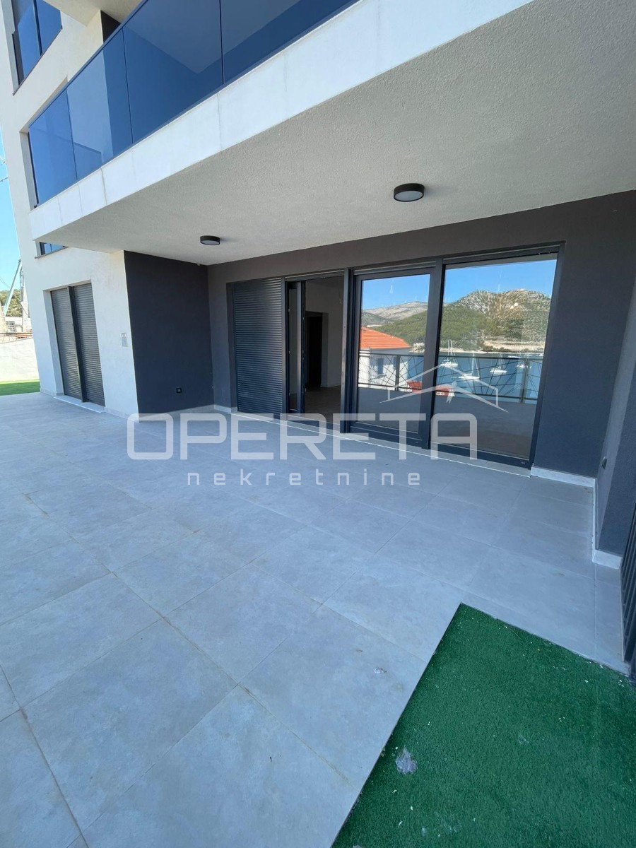 Na svega pedeset metara od mora nalazi se prostrani stan u prizemlju ukupne površine 107,64 m² koji nudi udobnost i praktičan raspored prostorija. Lođa veličine 9,08 m² proširuje životni prostor prema va