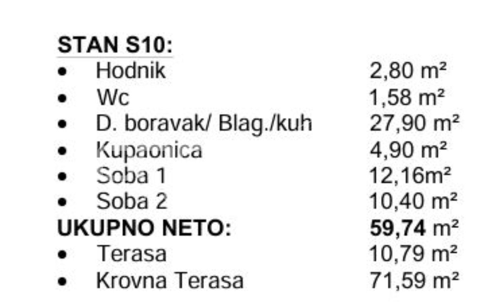 Stan S10 smješten je na 2. katu i prostire se na 59,74m² pažljivo osmišljenog prostora koji uključuje: hodnik, wc, kupaonicu, prostran dnevni boravak povezan s kuhinjom, 2 spavaće sobe te terasu površine 10,79m2 (koef. 0,50=5,39m2), krovna terasa 71,59 (koef.0,25=17,90) za opuštanje.