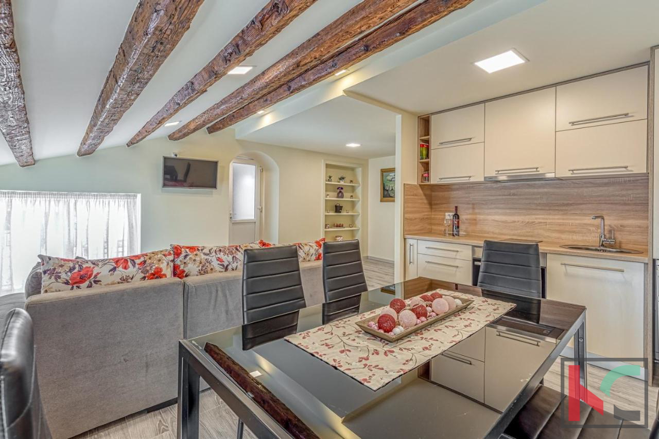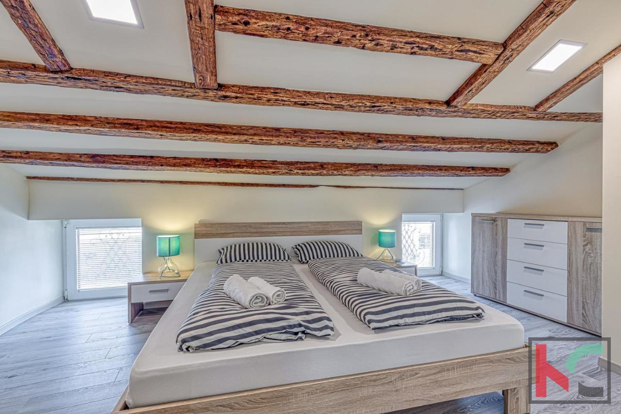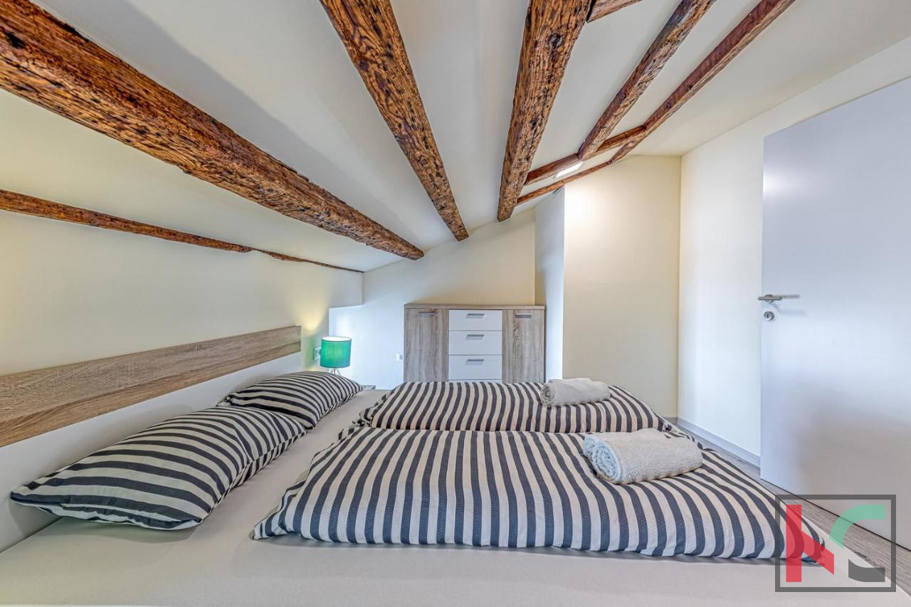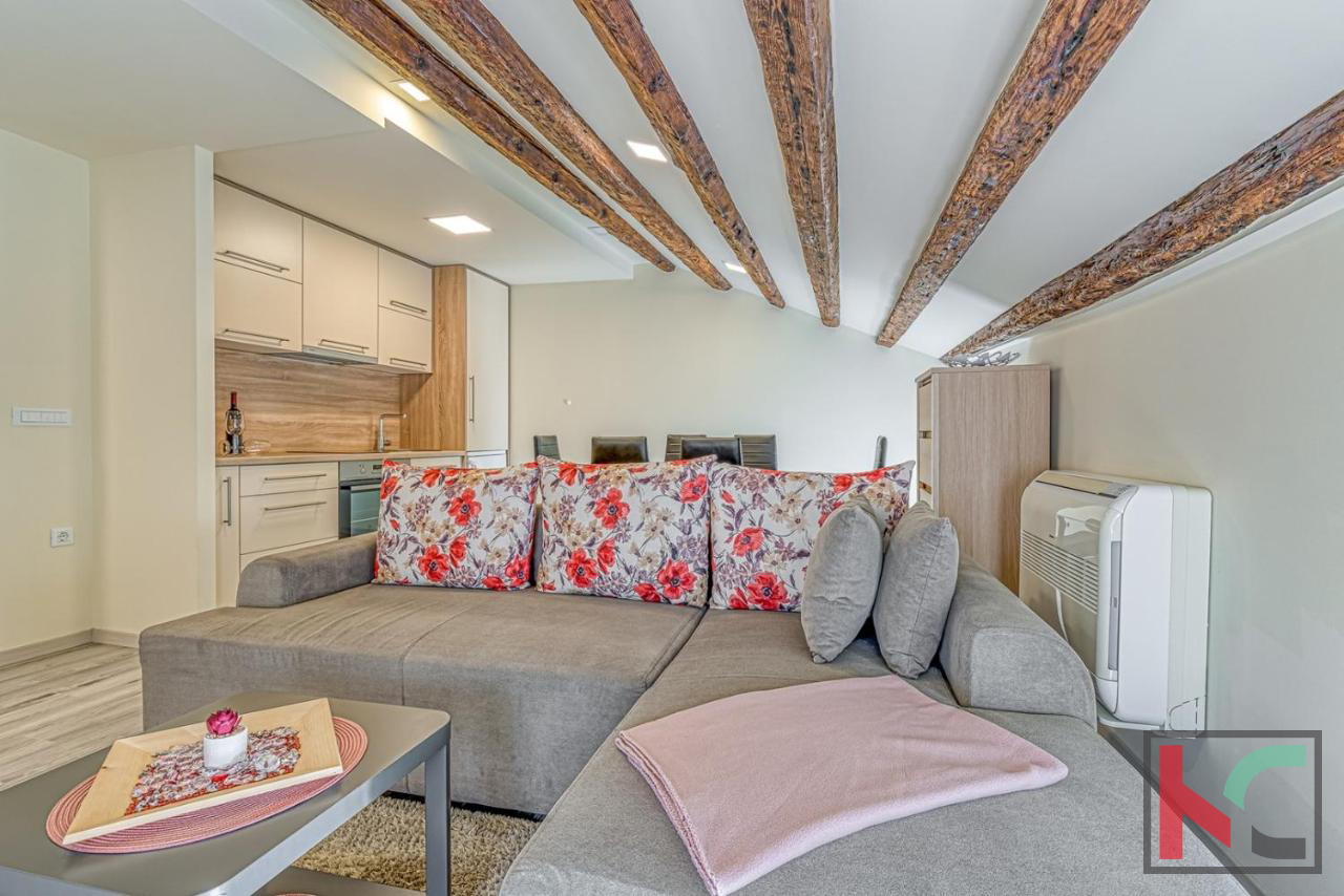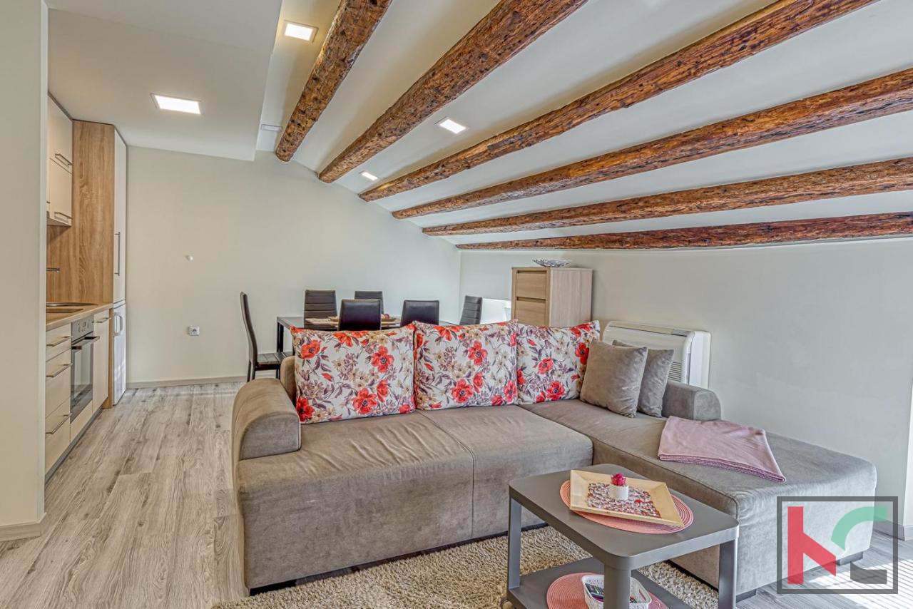For sale is an apartment of 48 m2 located in Poreč, in the attic of a three-story building. This charming 1.5-room apartment offers an extraordinary view of the sea, situated in the first row to the sea, making it an ideal choice for those who want to enjoy the view of the sea and sunset from their own terrace. The apartment is oriented towards the south and west, ensuring plenty of natural light during the day. The space includes one bedroom and a spacious living room that offers comfort and functionality. An additional advantage of this apartment is the balcony, which provides a perfect place to relax with a beautiful view of the sea. Heating is provided via air conditioning, ensuring a pleasant temperature throughout the year. The apartment is located in a historic setting, further enhancing its attractiveness and uniqueness. The location of the apartment is exceptional, with immediate proximity to the sea and all necessary amenities for daily life. Poreč is known for its rich cultural heritage, beautiful beaches, and vibrant social life, making it a perfect place for living or investment. We invite interested buyers to contact us for additional information or to arrange a viewing. This apartment represents a unique opportunity to enter the real estate market in one of the most sought-after locations on the coast.