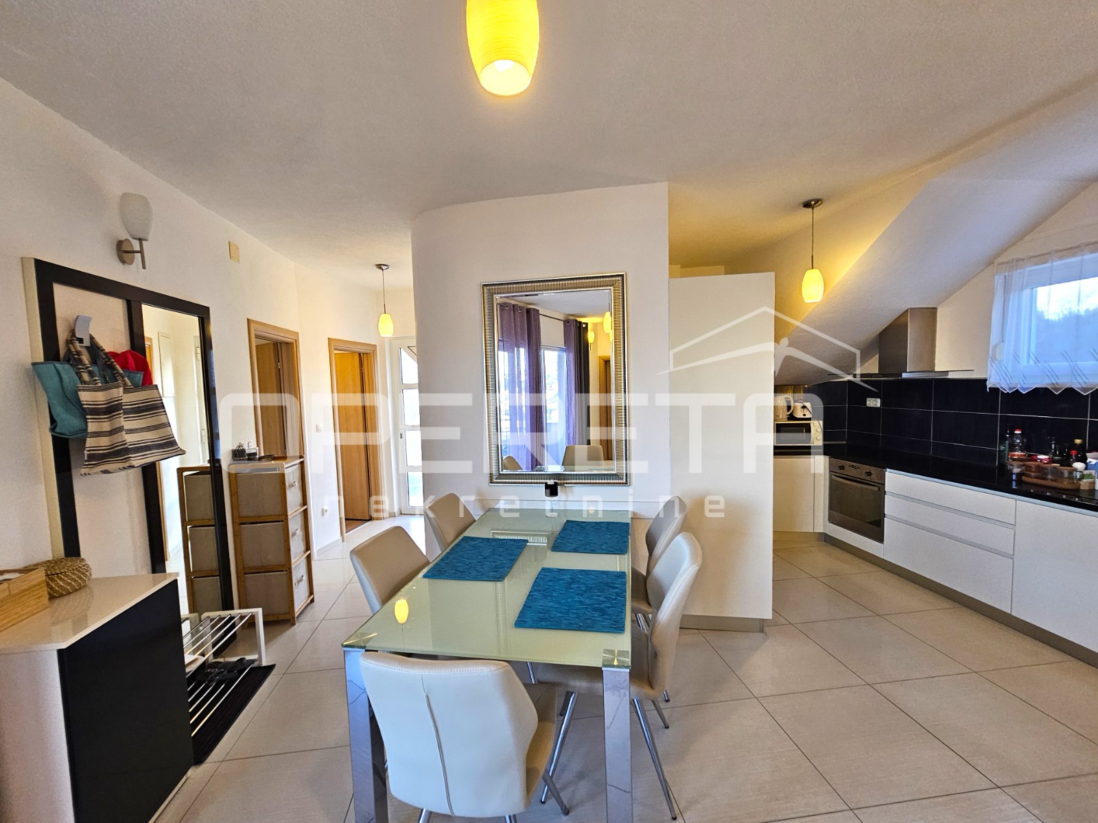 In a quiet and sought-after area of Okrug Gornji, near Trogir, this spacious and functional apartment is located, offering a perfect blend of comfortable family living and an excellent