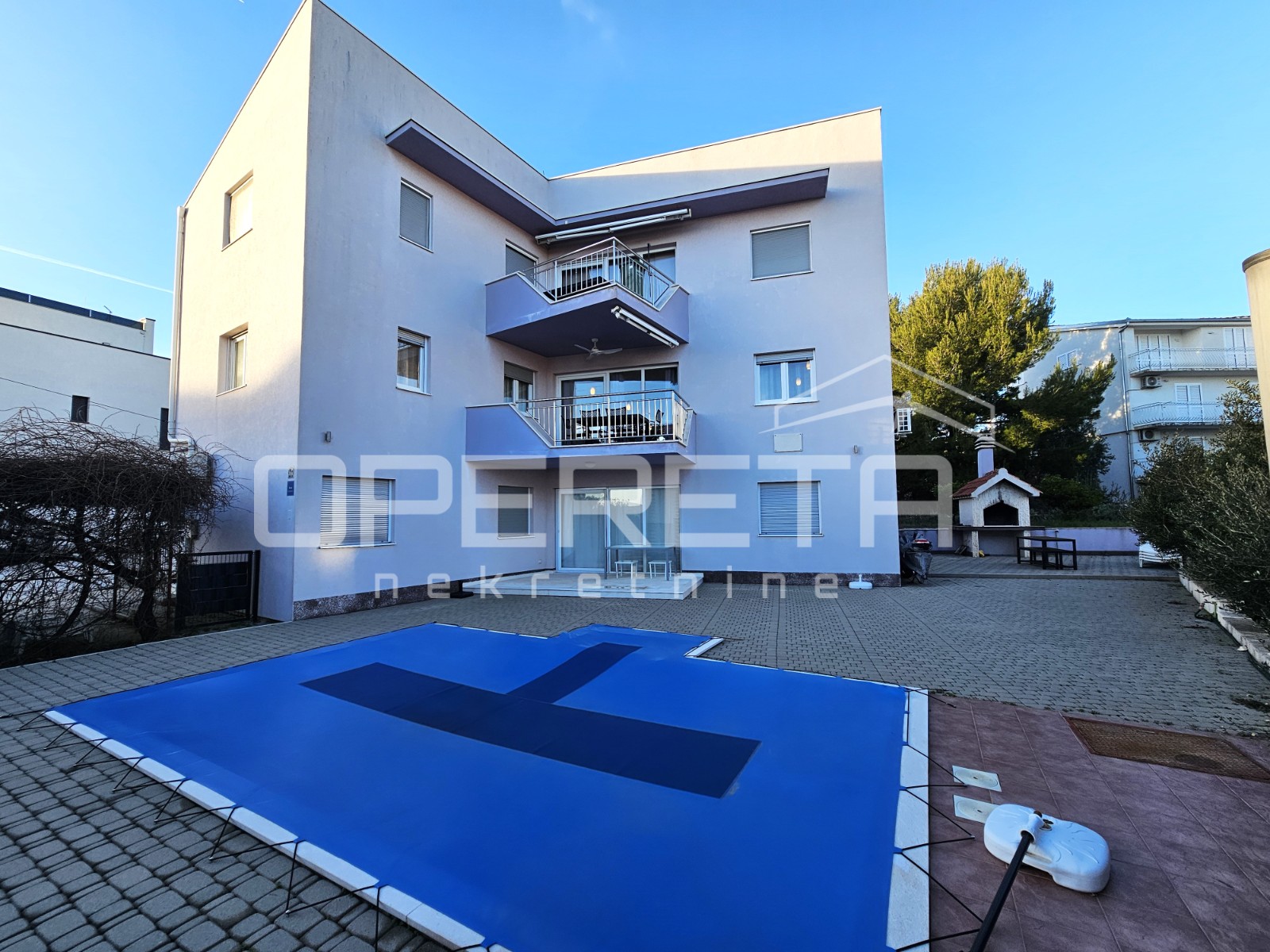 The shared courtyard is a true small Mediterranean oasis. It features a large swimming pool with a sunbathing area, as well as a barbecue area with an outdoor dining space, ideal for social gatherings, family lunches, and relaxation during warm days. Pool maintenance is organized by agreement, with shared costs among residents.
