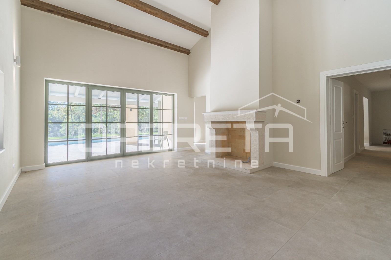 The ground floor features an entrance hall, a spacious kitchen with dining area, a living room dominated by a beautiful fireplace, a guest WC, and one bedroom with its own bathroom. Each room on the ground floor has direct access to the covered terrace, expansive sundecks, and the pool, creating a perfect blend of indoor and outdoor living.