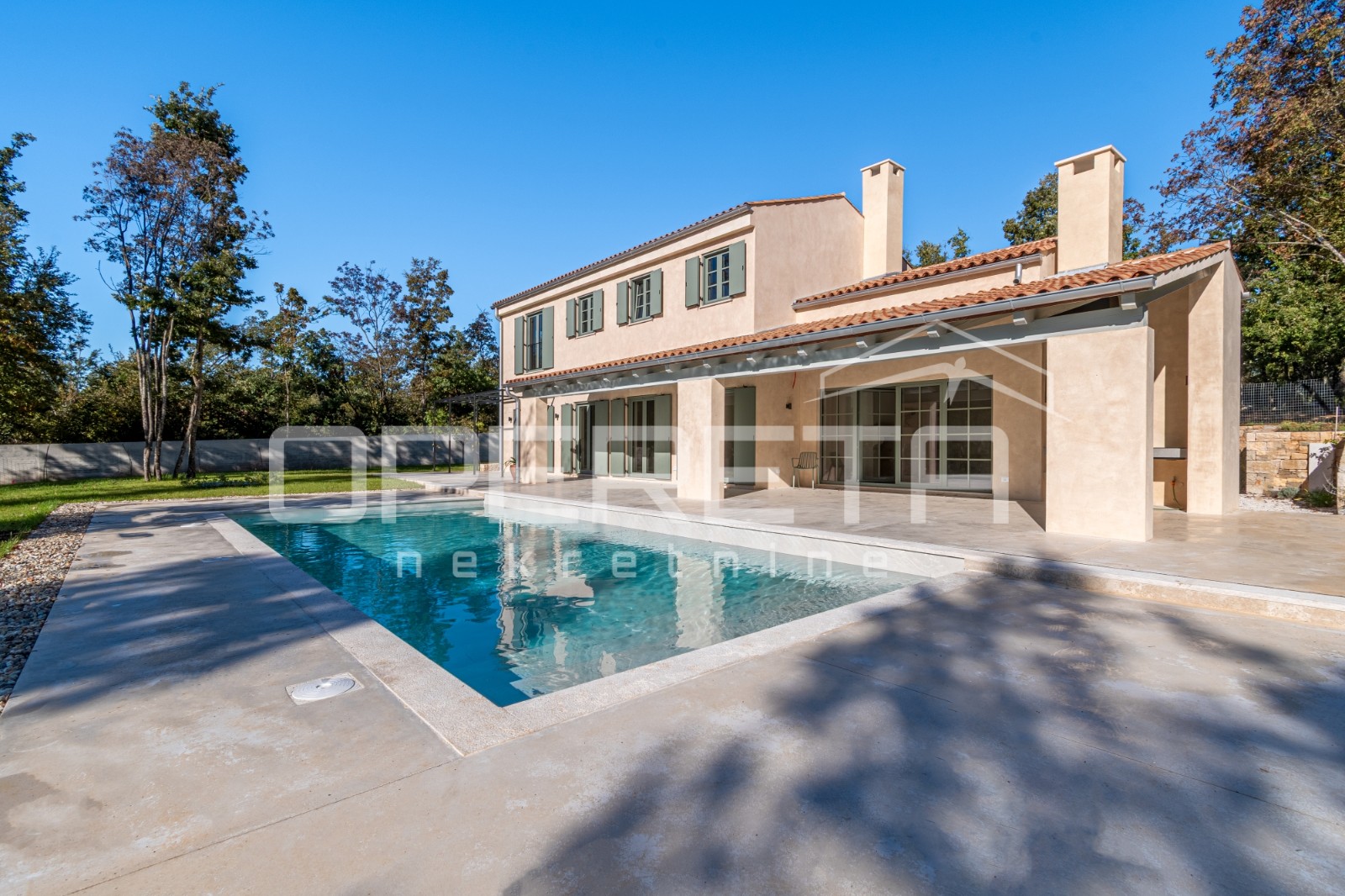 In the small Istrian village of Lindar, a traditional Istrian house with a pool is for sale, offering a total area of 227 m² on a 1000 m² plot. The house itself has a living area of 170 m² spread over two floors.