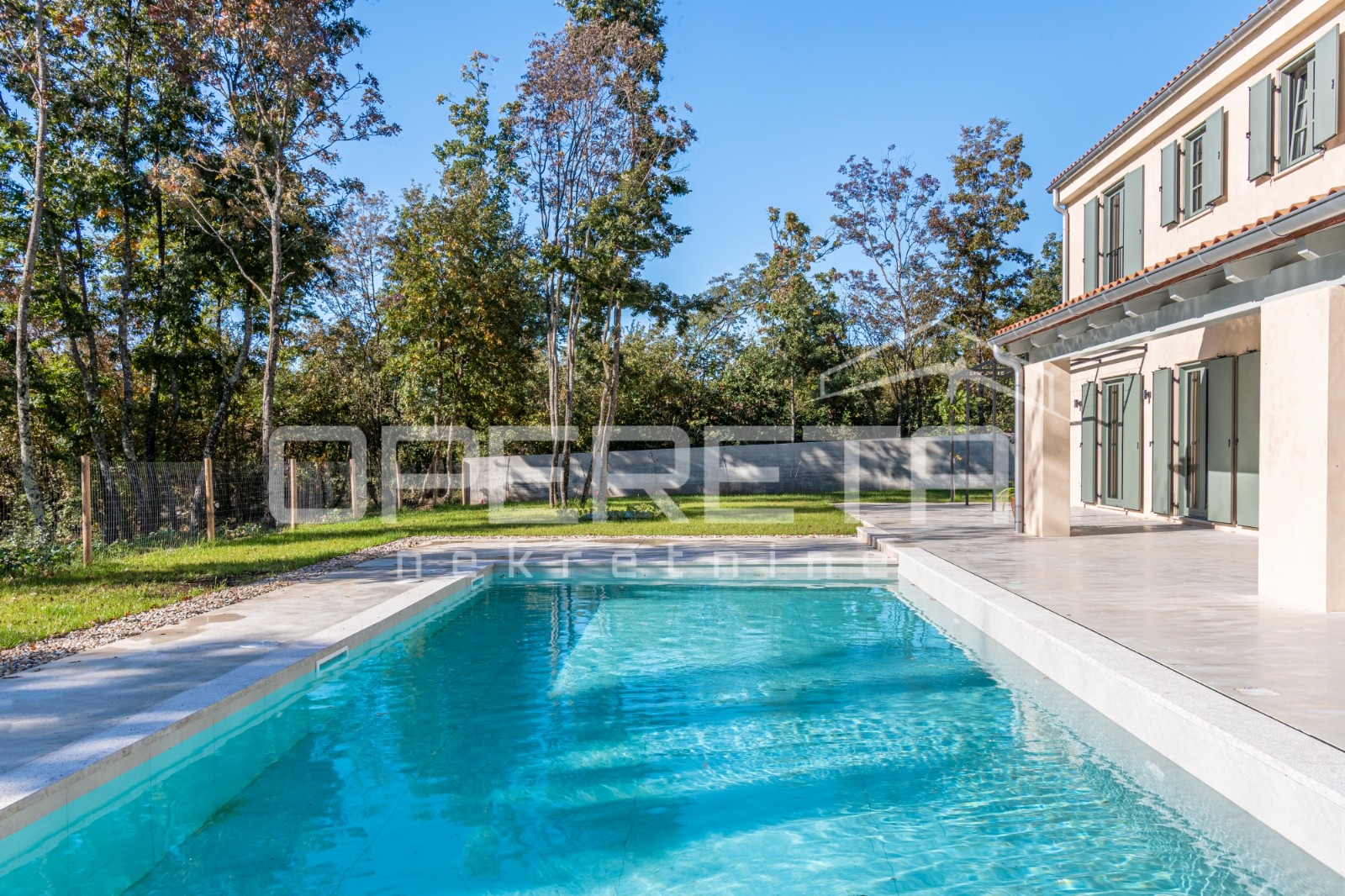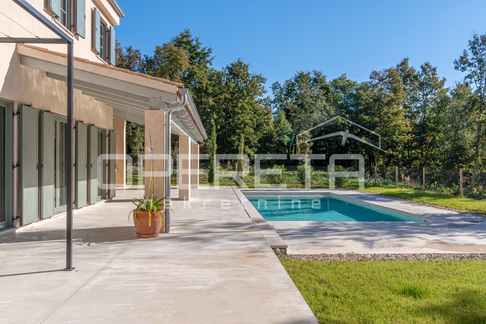 The exterior is designed for complete relaxation and enjoyment of nature. Besides the pool and spacious sundeck, the yard offers a beautifully landscaped Mediterranean garden and secure parking. As the property is situated in a secluded spot, surrounded by greenery, it guarantees complete privacy and tranquility.