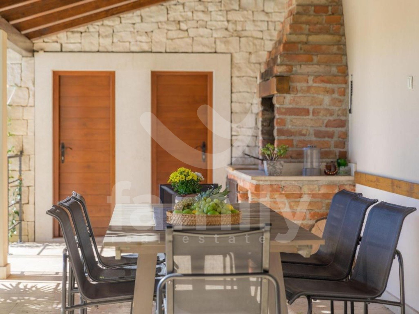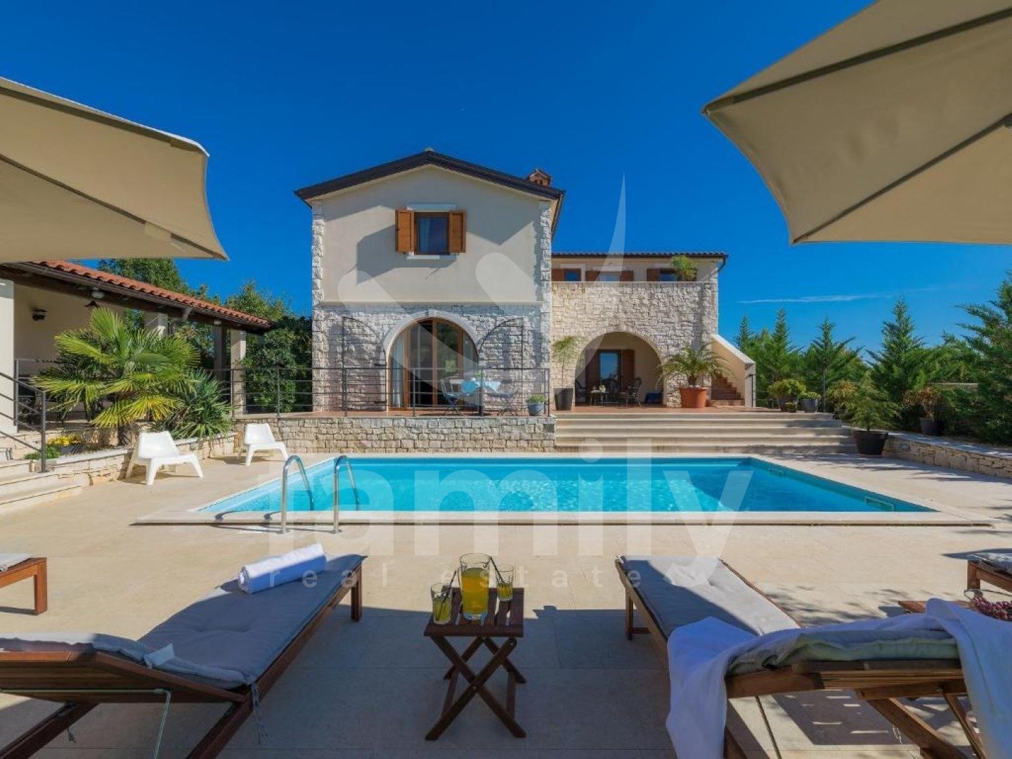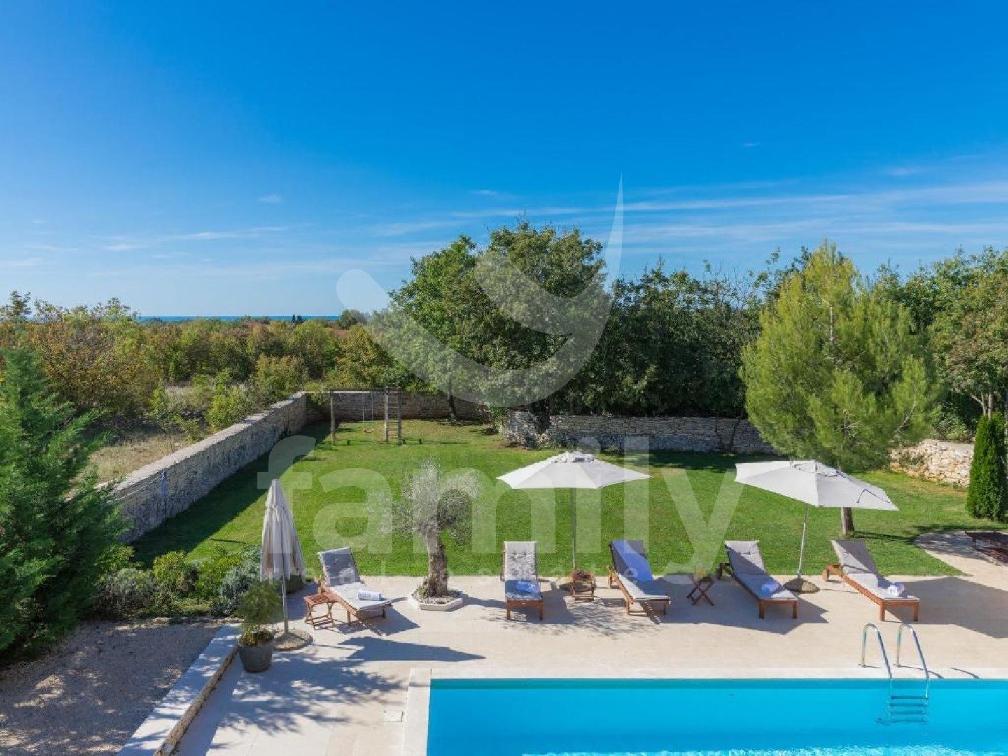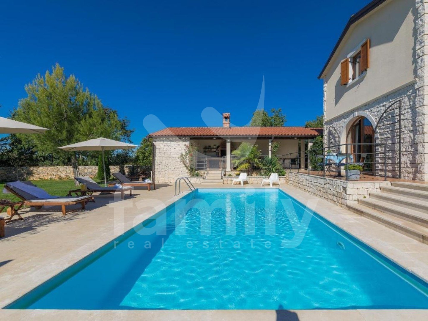 eptionally quiet location, which offers complete privacy and harmonious coexistence with nature on a plot of 1,527 m². The property has a total living area of 220 m² and is spread over two floors and exudes warmth, elegance and a carefully designed layout. On the ground floor there is a spacious living room with a fireplace, connected to the dining room and kitchen in an open space concept, from which you can exit to a covered terrace with a summer kitchen, a built-in barbecue and an outdoor dining area - the perfect place to enjoy the view of the pool and greenery. On the same floor there is also one bedroom with its own bathroom and access to the terrace. On the first floor there are three spacious bedrooms, each with its own bathroom and terrace, which offer a captivating panoramic view of nature and the sea. All rooms are air-conditioned, ensuring maximum comfort throughout the year, and the floors throughout the building are covered with high-quality ceramics. A special value for this property is given by the carefully landscaped garden with a 24 m² swimming pool, a sunbathing area and a landscaped beach, as well as rich horticulture with automatic irrigation. The property is completely fenced, mostly with indigenous dry stone walls, which further emphasizes authenticity and privacy. There is also a spacious parking lot and a landscaped children's playground. Buying a stone house on a large plot of land in Svetvinčenat represents a combination of authentic Istrian charm and a modern way of life. Traditional stone construction provides special warmth, durability and timeless aesthetics, while the spacious plot ensures peace, privacy and numerous design options - from a swimming pool and garden to additional amenities for enjoyment. This location offers the perfect balance between nature and accessibility - you are surrounded by greenery and silence, and at the same time a short distance from the sea and larger cities. This is precisely why such properties are highly sought after both for personal vacations and as an investment in tourist rentals. A large garden further increases the value of the property, providing the freedom and comfort that is increasingly sought after today – whether for family life, an escape from the city crowds or a luxurious vacation in your own quiet corner of Istria. FOR ALL OTHER INFORMATION CALL: + Danijela Milotić Assistant in mediation
