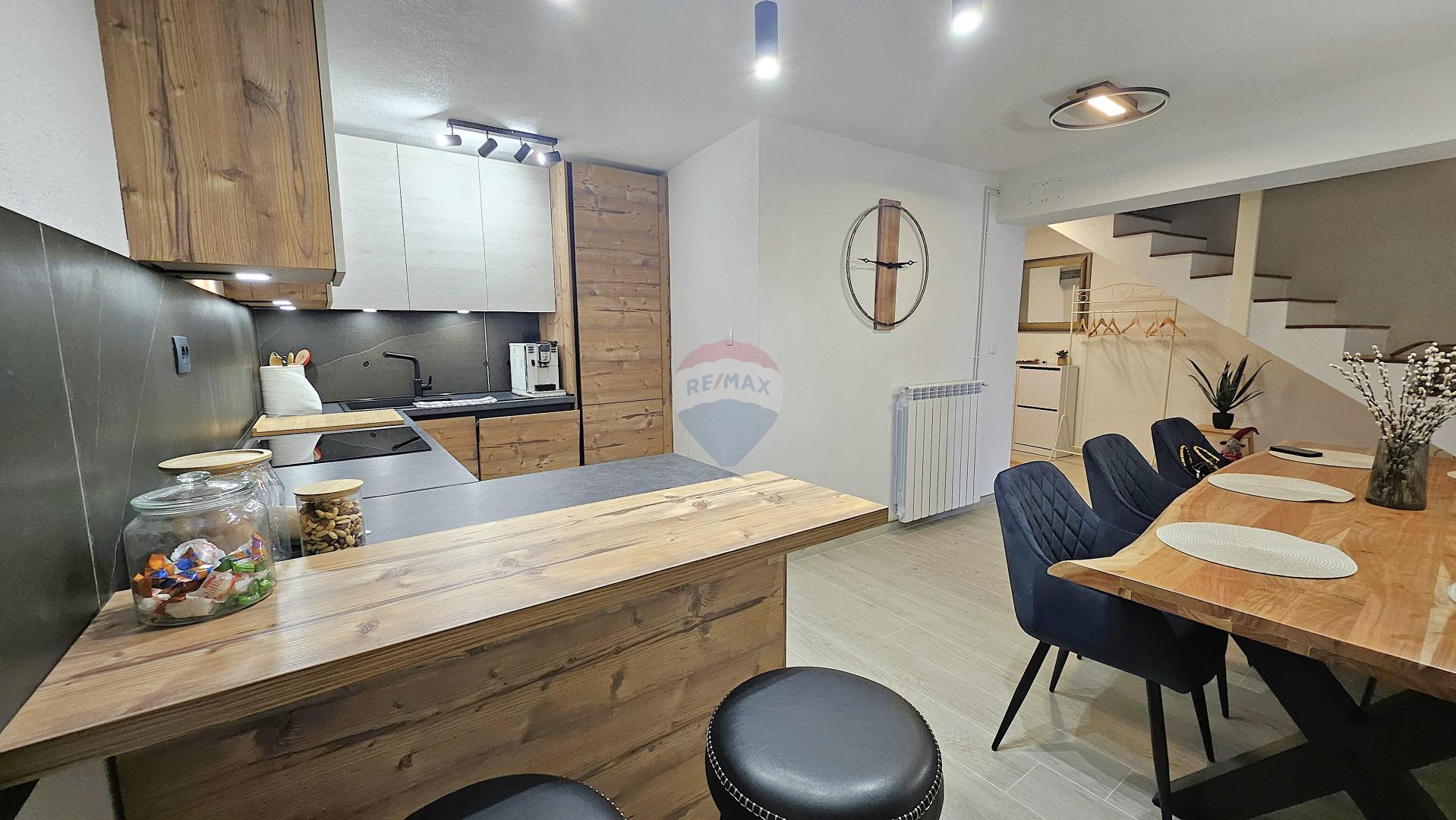 This terraced house extends over three floors with a total living area of approx. 150 m². The ground floor features a spacious kitchen with dining area, entrance hall, bathroom, and a large living room with access to a spacious terrace overlooking the surrounding nature. The first floor consists of two comfortable bedrooms and a bathroom, followed by a beautiful terrace with panoramic views. The second floor is occupied by a large bedroom stretching across the entire level.