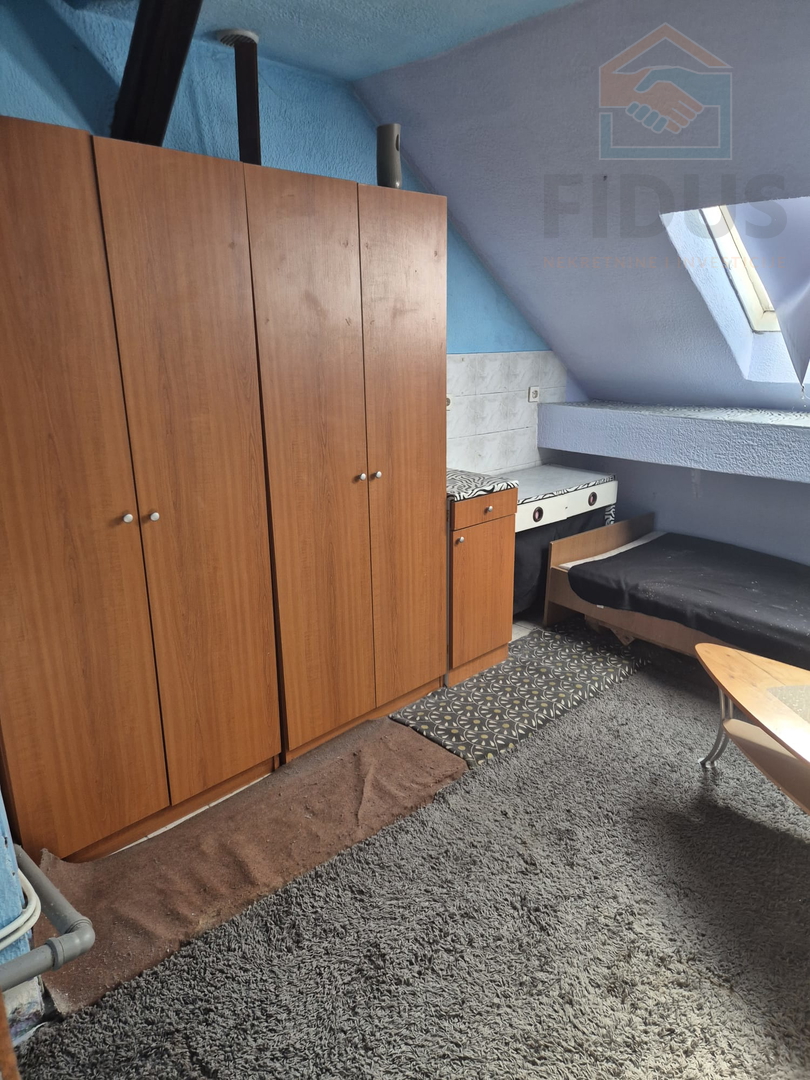 d) stan u potkrovlju/iznad uličnog lokala površine cca 35 m2 (dvije sobe, kuhinja, kupaonica)