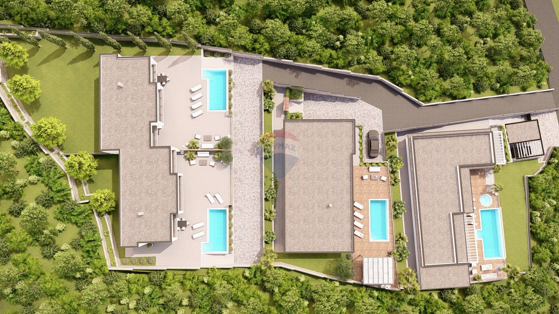 Vila se proteže na tri etaže. U suterenu se nalazi garaža površine 45,5 m², pogodna za dva automobila, kao i kotlovnica. Prizemlje obuhvaća ulazni hodnik, vešeraj, spremište, gostinjski toalet, te prostranu kuhinju s blagovaonicom koja se prirodno nastavlja na dnevni boravak. Iz dnevnog prostora izlazi se na veliku terasu s koje se pruža očaravajući pogled, a na kojoj su smješteni bazen sa sunčalištem, natkrivena ljetna kuhinja s roštiljem i vanjska blagovaonica – idealna za ljetna druženja i opuštanje.