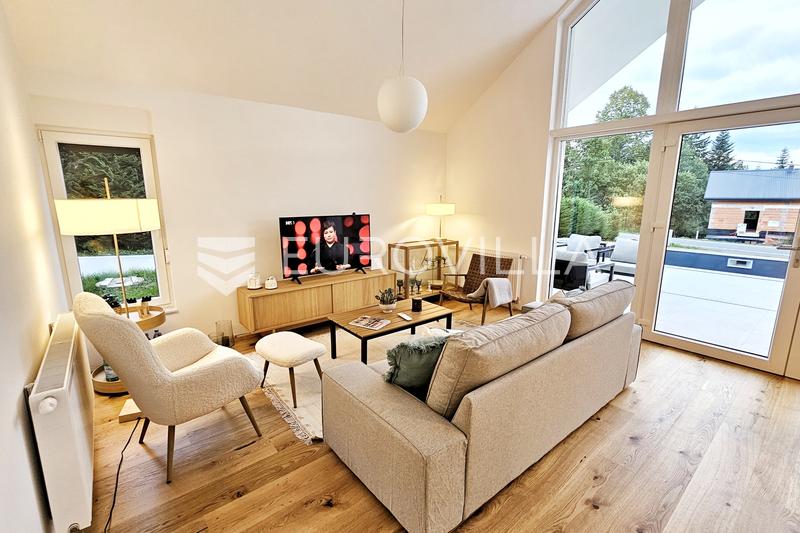 Gorski kotar, Kupjak, prekrasna novoizgrađena samostojeća kuća površine 115 m2, na parceli površine 1600 m2, smještena 200 m od sanjkališta Gorski sjaj.Nalazi se neposredno uz staru cestu Rijeka - Zagreb, svega 3 min vožnje od autoceste.Sastoji se pr