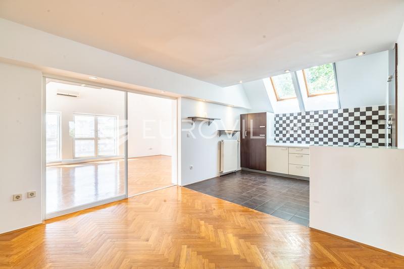 Prekrasan dvoetažni stan na drugom i trećem katu renovirane i dobro održavane zgrade sa pet stanova, smještene na izuzetnoj lokaciji u Pavlinovićevoj etaža ima ugodan ulazni prostor, prostrani dnevni boravak površine 42 m² izlazom na balkonom (15 m²