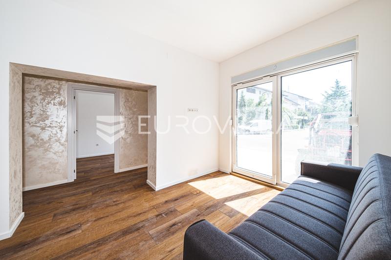 Trnovčica, trosoban stan u prizemlju novogradnje, površine 64 se od: predsoblja, dnevnog boravka s kuhinjom i blagovaonicom, spavaće sobe i ima namještenu kuhinju i kuhinjske aparate, opremu: pvc stolarija, protuprovalna ulazna vrata, vrhunsku kera