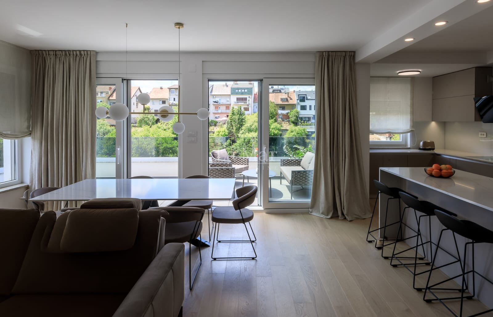 Interijer je pažljivo osmišljen i u potpunosti opremljen kvalitetnim namještajem, što omogućuje useljenje bez dodatnih ulaganja. Središnji dio stana čini prostrani dnevni prostor s puno prirodnog svjetla, koji se prirodno nadovezuje na kuhinju i blagovaonicu u otvorenom konceptu. Uz kuhinju se nalazi i ostava.