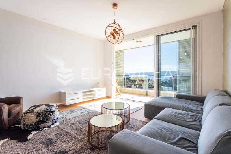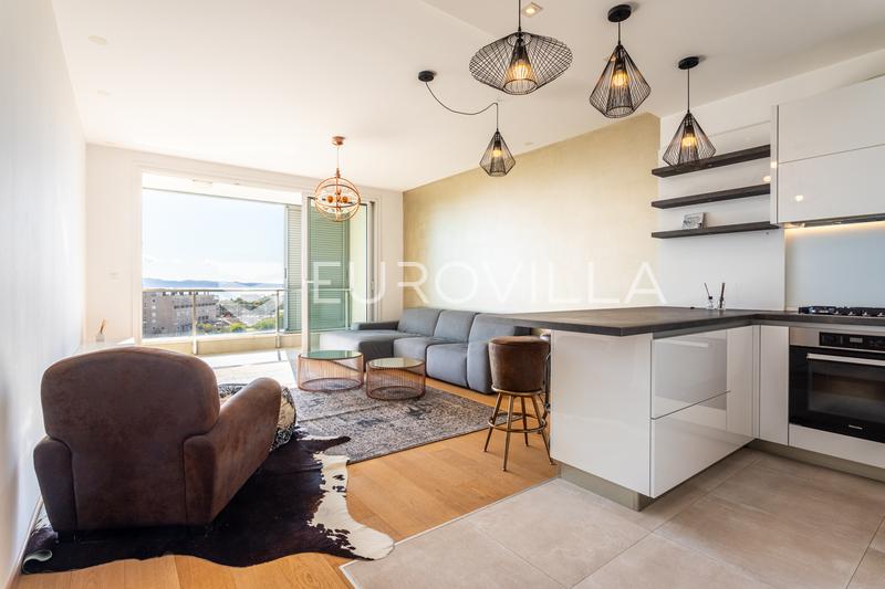Split, Trstenik, prostran dvosoban stan dostupan za dugoročni je položen na petom katu stambene od hodnika, wca, kupatila, dvije spavaće sobe, dnevnog boravka, kuhinje s blagovaonicom, te lođe s koje se pruža predivan pogled na more i grijanje se
